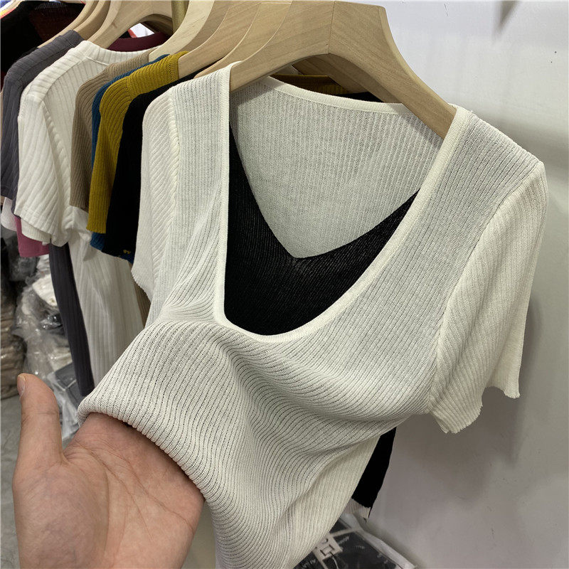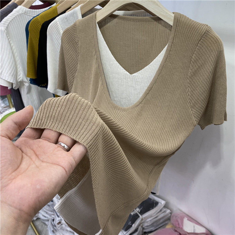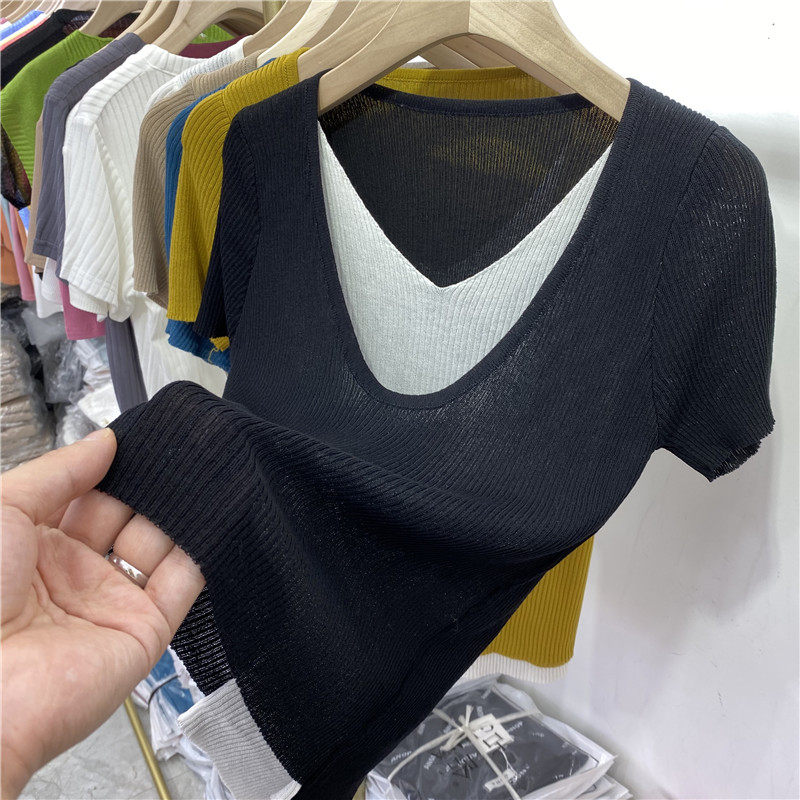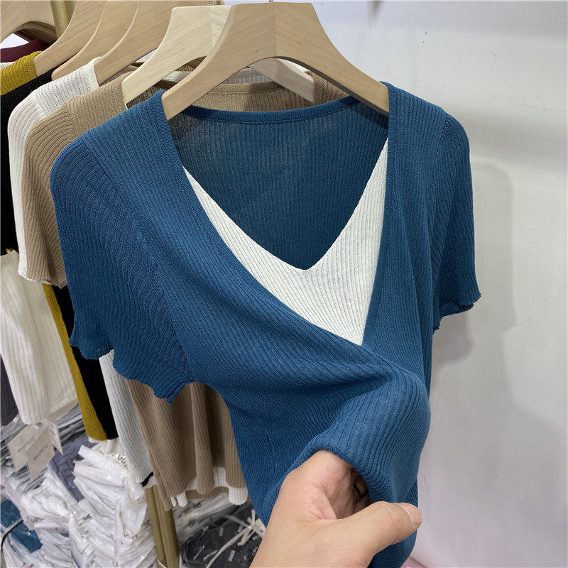 V Collar Ice Knit Fake Two Blouse Women 2022 Spring Summer New Foreign Pie 100 hitch short sleeve T-Shirt Chains