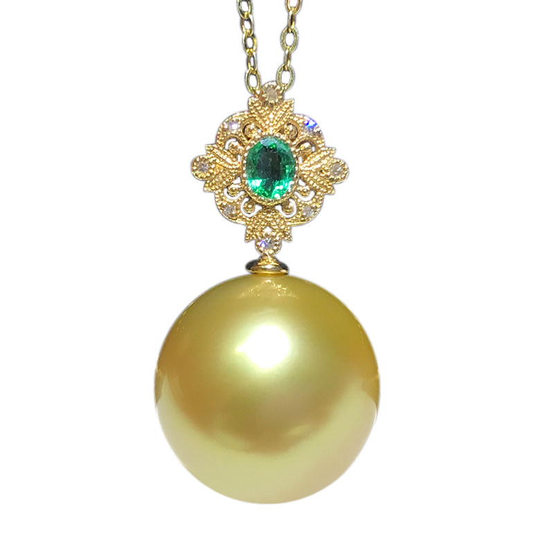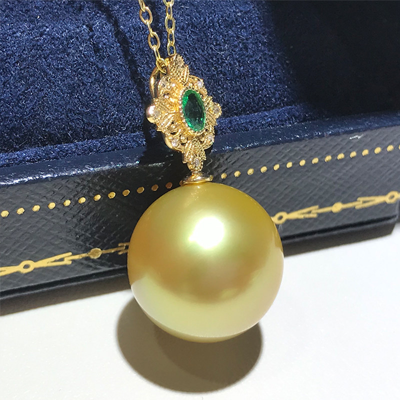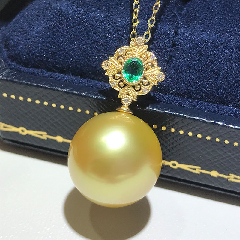 14-15mm natural Nanyang gold pearl pendant 18K gold diamond Philippine sea water pearl necklace with positive light