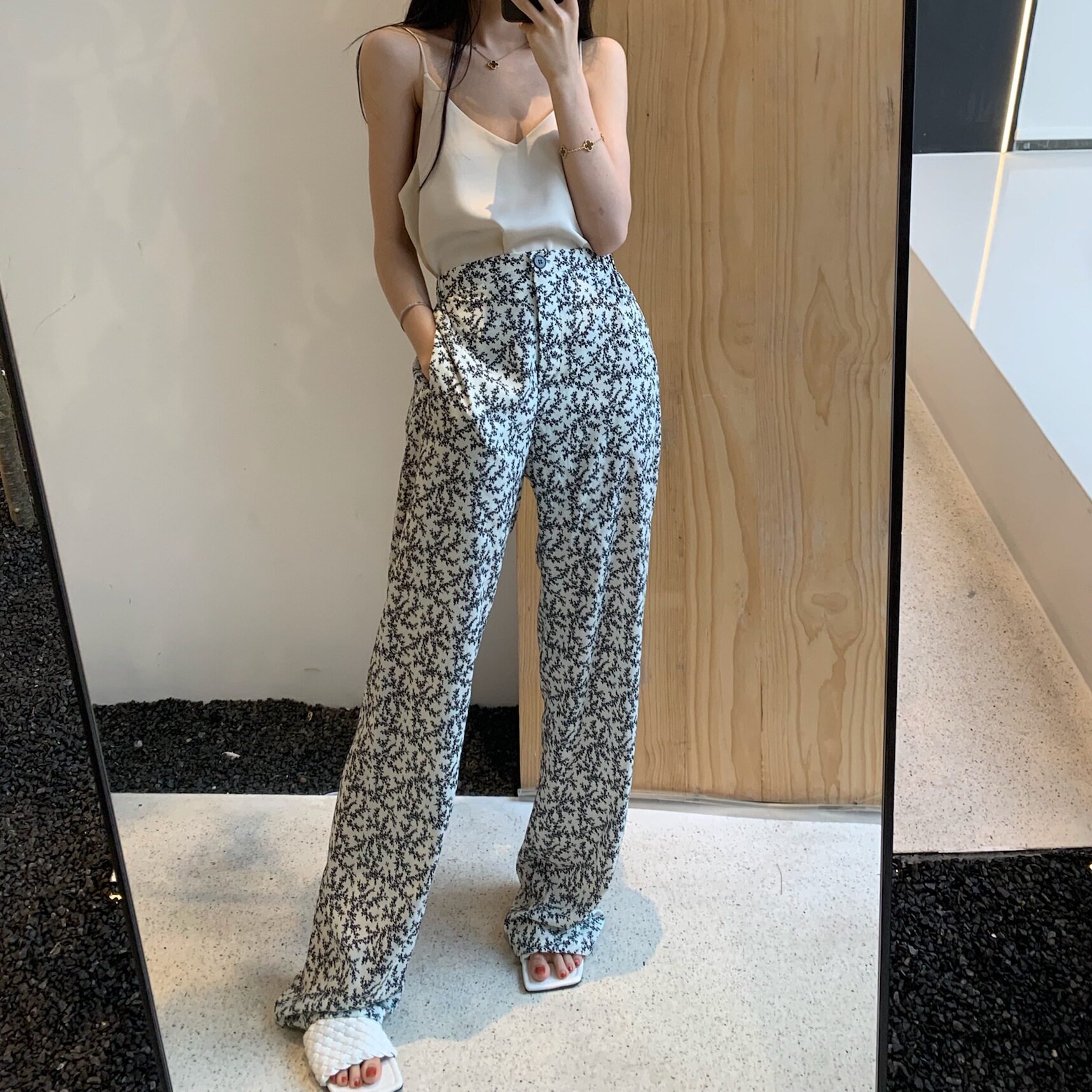 White thin floral high waist wide pants Loose thin mopping pants Casual pants women's spring and autumn ins tide wild