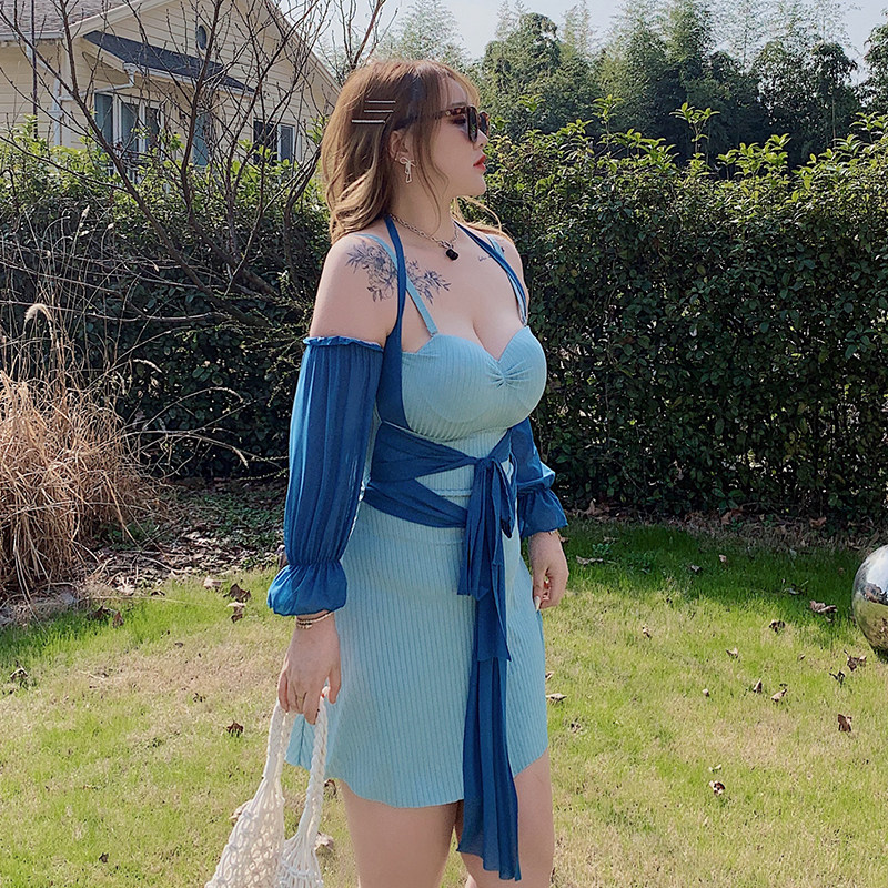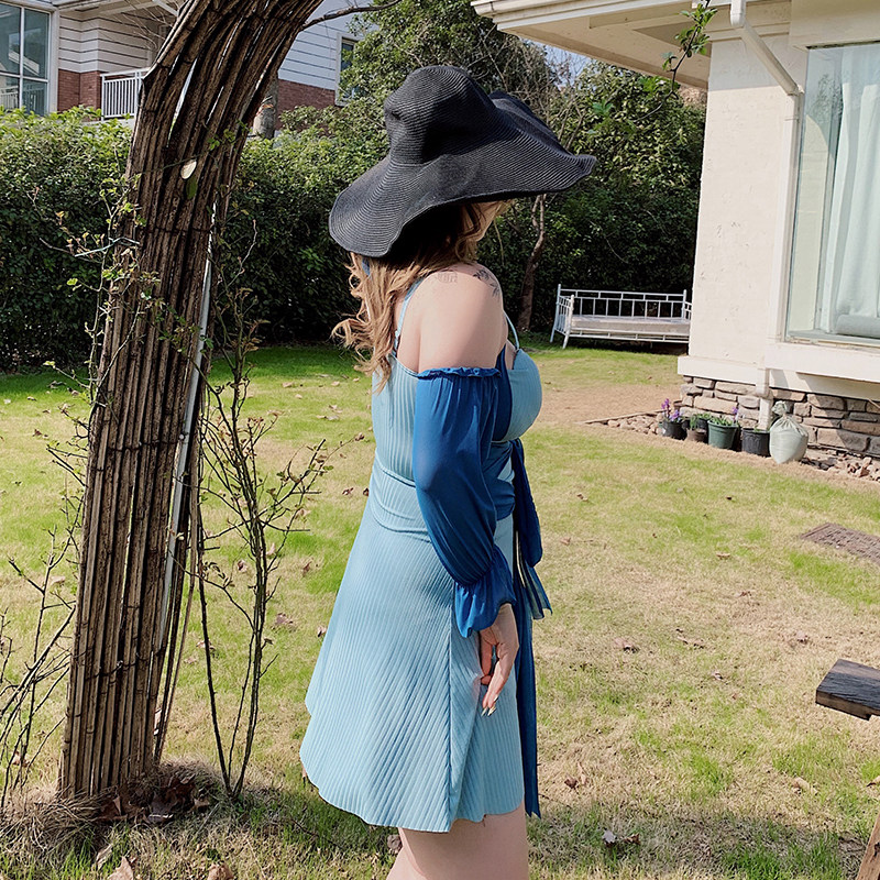 Hitong Grand Size Women's Dress Fat Mm Strap Closed Waist 90% Sleeves Hung Neck Swimsuit Temperament Elegant Display Slim Spa Swimsuit