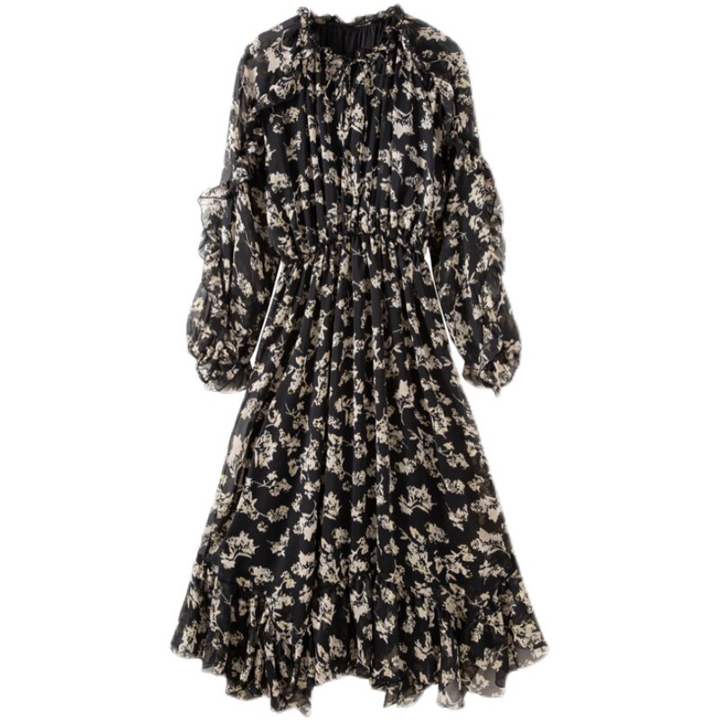 French maje Ouyang Nana with the same collection waist display slim retro temperament crushed long sleeve fairy Ocean dress