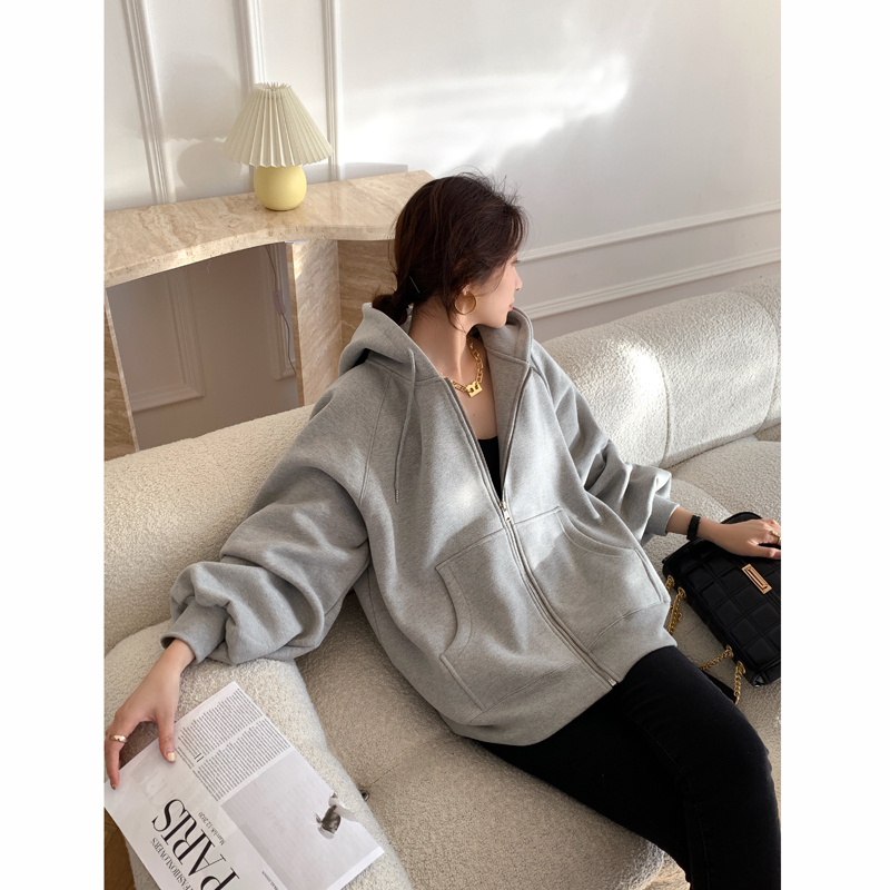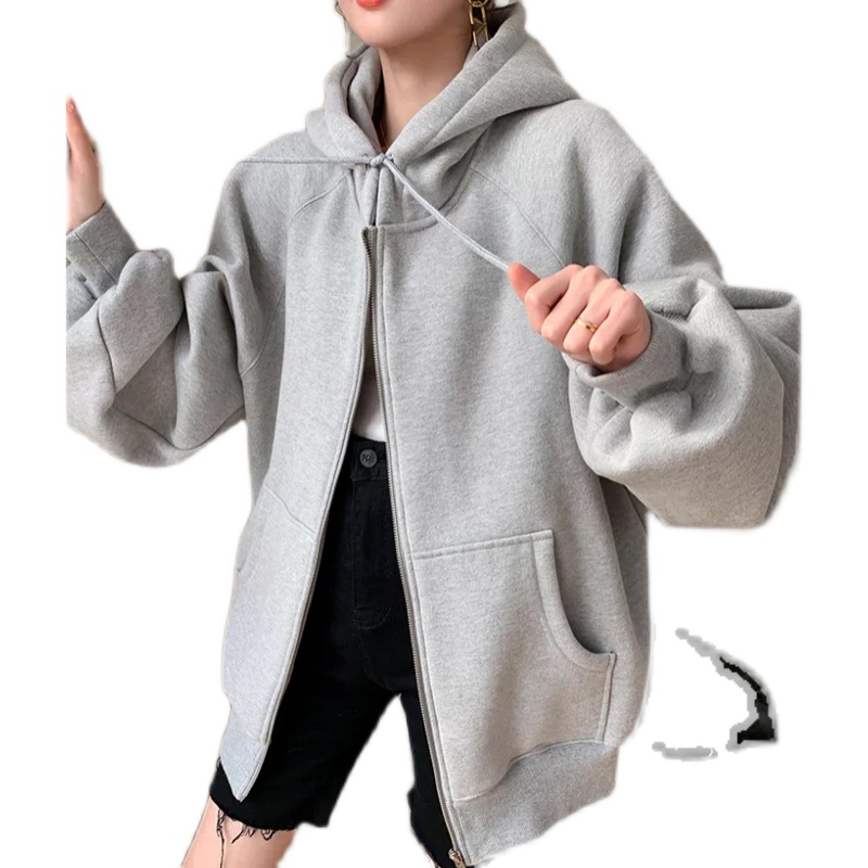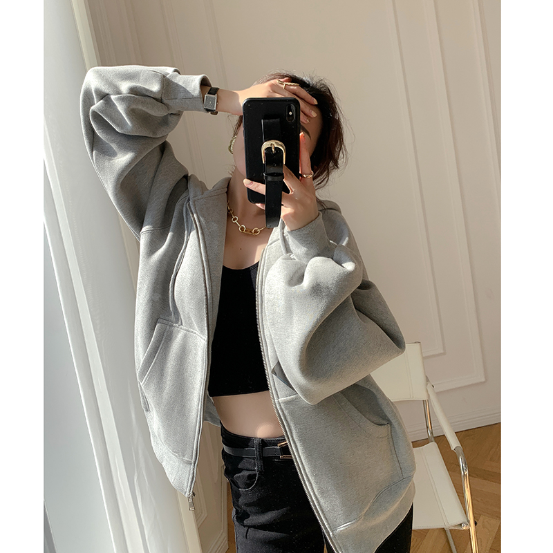 EAMDOE22 spring autumn new trendy temperament in long version grey thick cotton T cardiovert woman loose outline drawing rope jacket