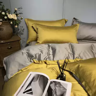 High-end luxury summer tencel four-piece quilt cover bed sheet Simple silky solid color summer cool feeling ice silk bedding
