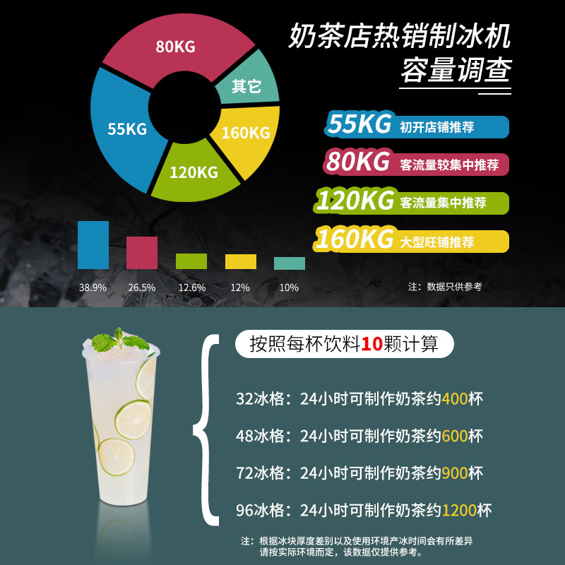 32 ice grids -55 kg-first open milk tea shop recommended 50 ice grid -85 kg-small milk tea shop recommended 60 ice gg -100 kg-small and medium milk tea shop pushing 72 ice gg -120