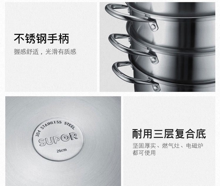 Supor steamer household 304 stainless steel three-layer thickened 26cm small steamer steaming fish induction cooker gas universal