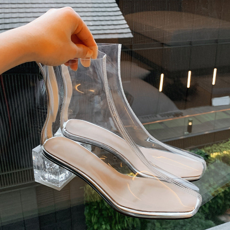 Candy color boots women's block heel transparent boots summer sandals sexy socks boots crystal heel nightclub square head high heels
