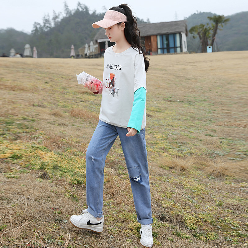 Girls' autumn sweater 2022 new net red 12 fake two pieces casual loose 15-year-old middle-aged children's long-sleeved top 13