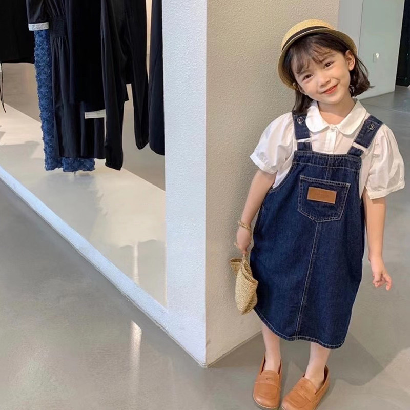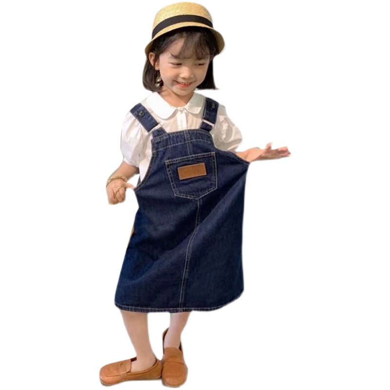 Korean version 2022 summer girls short-sleeved white shirt denim baby bag skirt two-piece children's Western style fashion suit