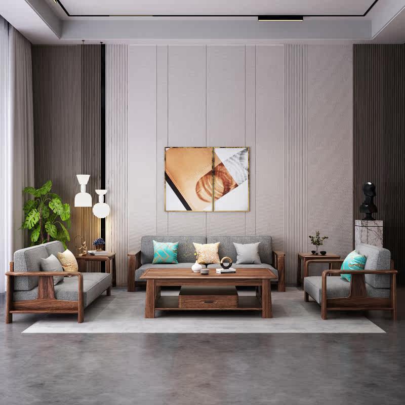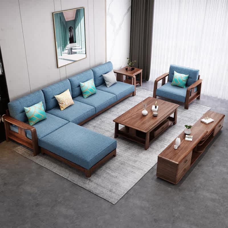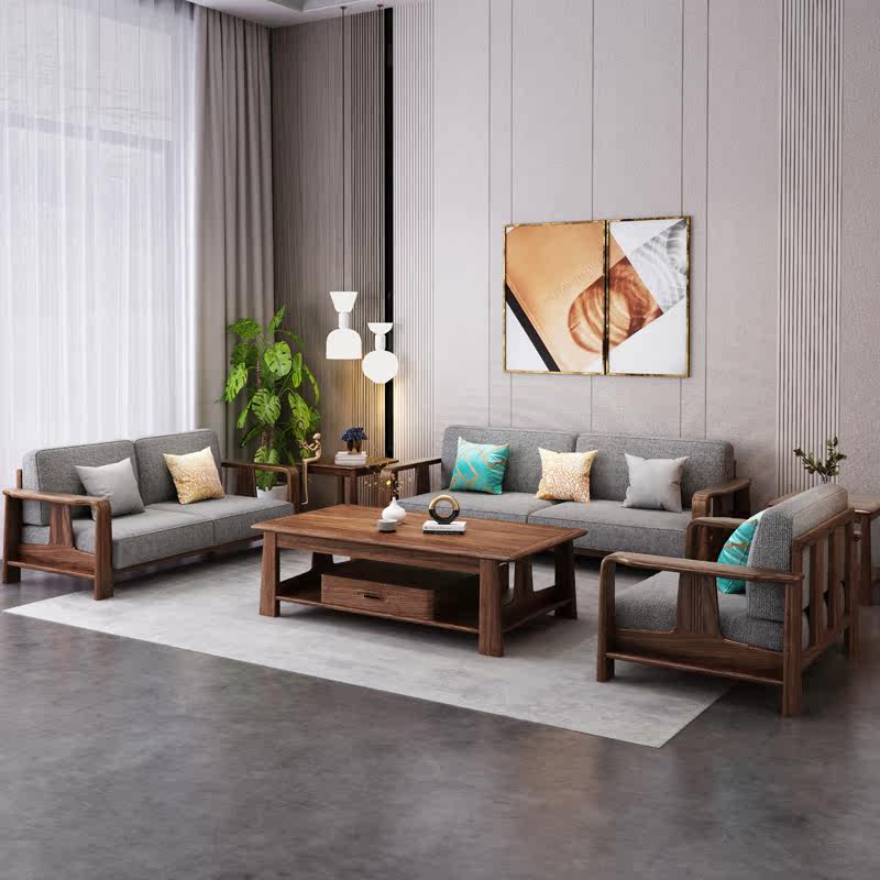 New Chinese style full solid wood sofa tea table combination modern black gold wood light luxury big ping five-piece living room wooden sofa