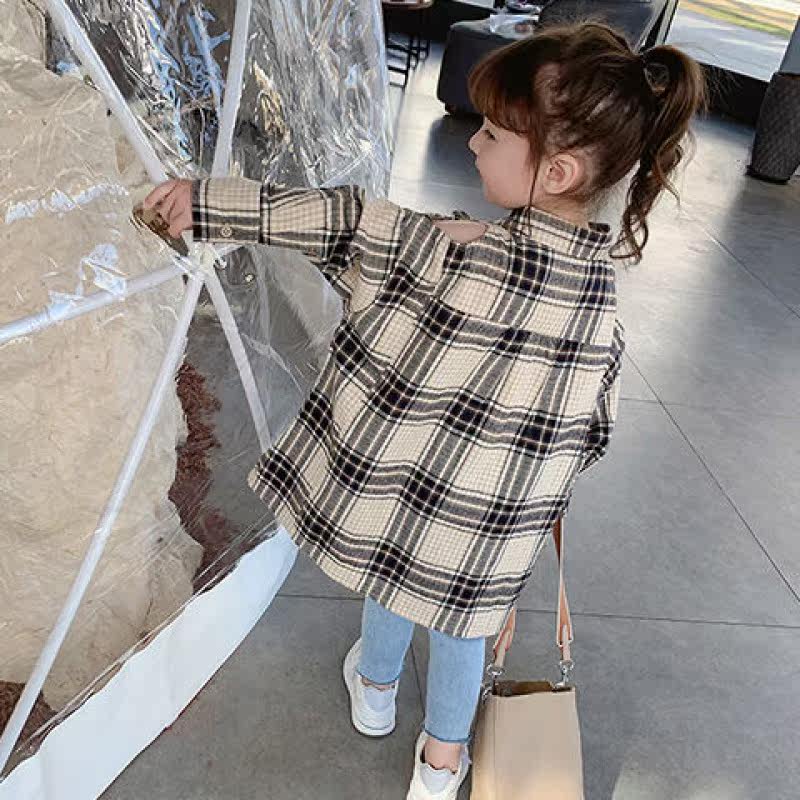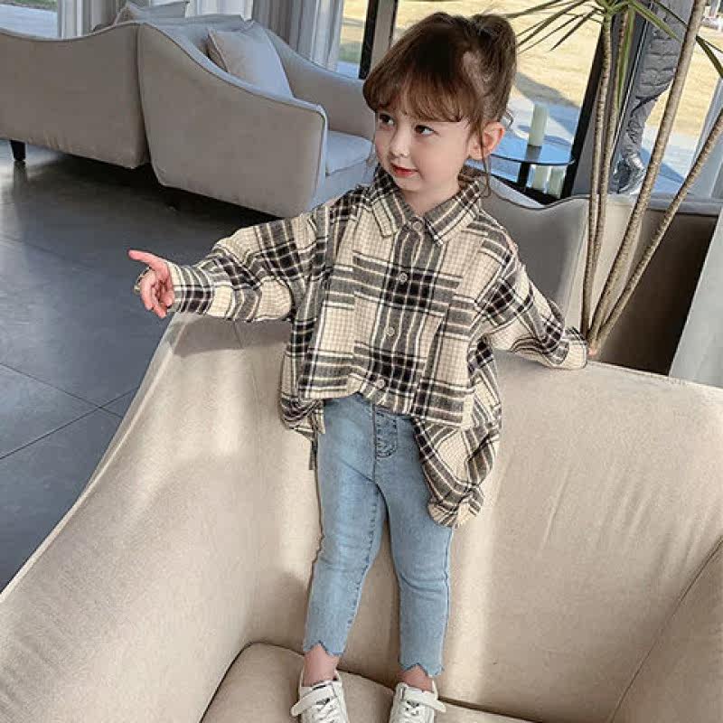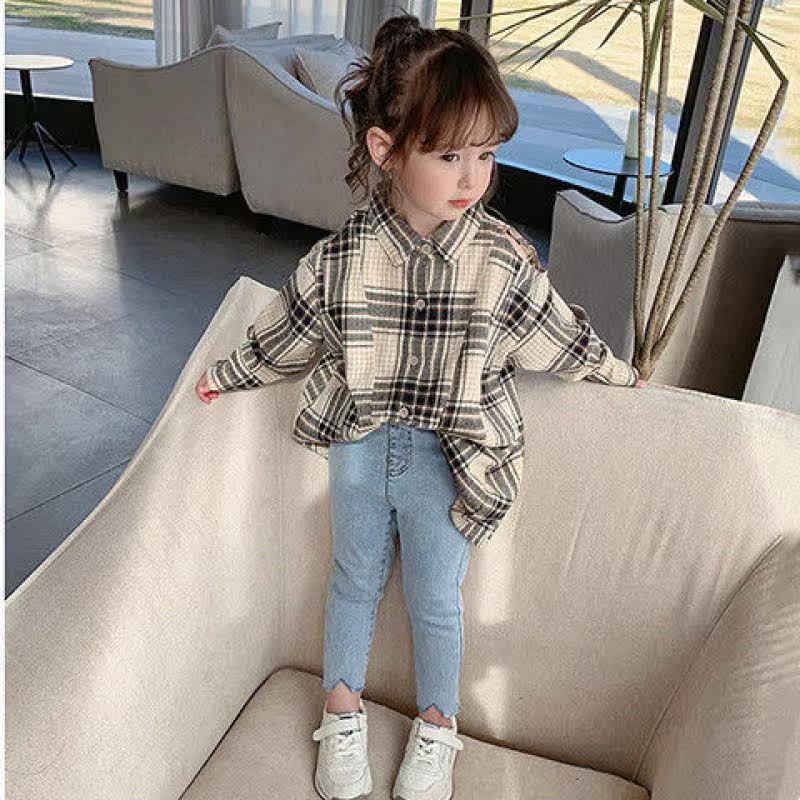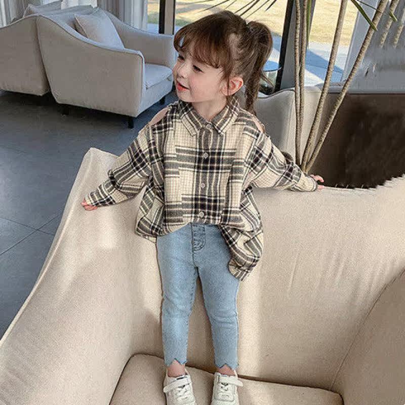Girl Shirt 2021 Spring Dress New Leaking Shoulder Plaid Korean Version Children Long Sleeve Shirt Foreign Pie in Long version of blouses