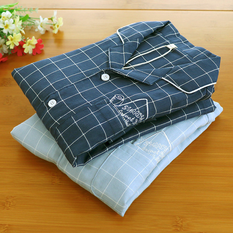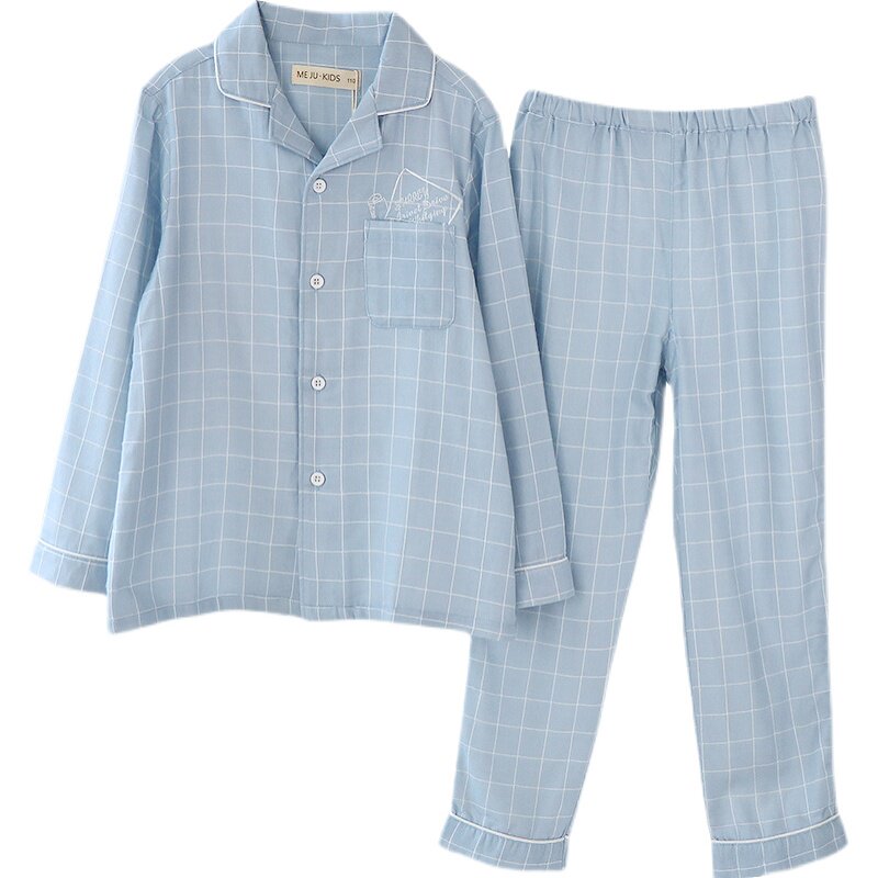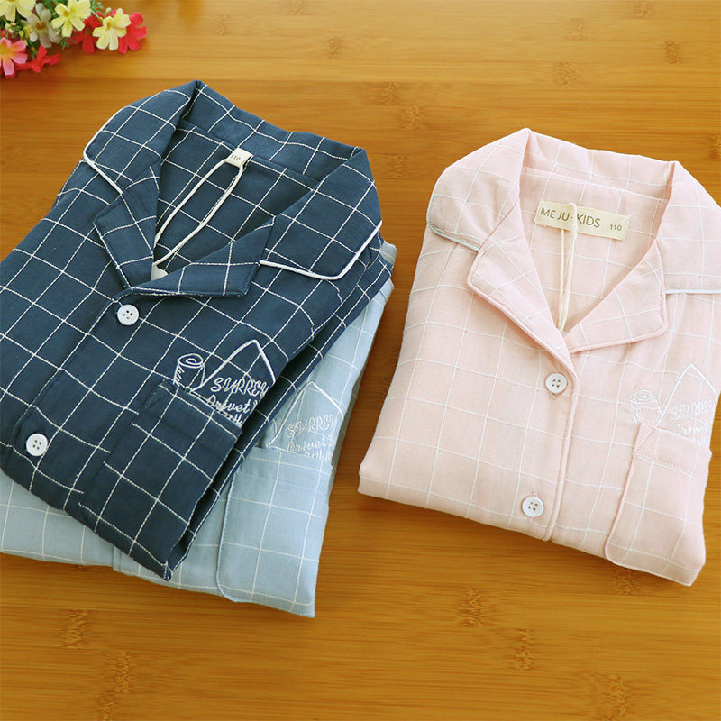 Handsome and embroidered floral Tired line checkered male and female children thin sleepwear spring summer full cotton double layer gauze long sleeve long pants suit