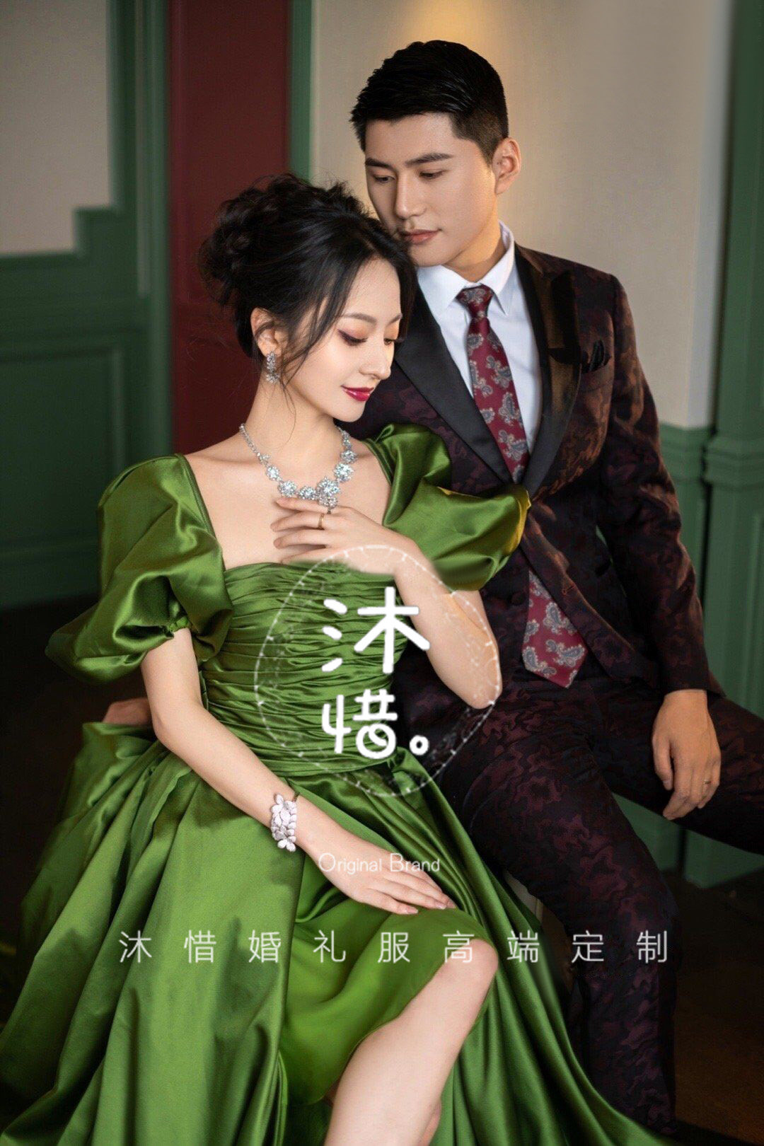 Wedding dress 2021 new bride princess bubble sleeve satin with simple atmospheric A swing dress green forest