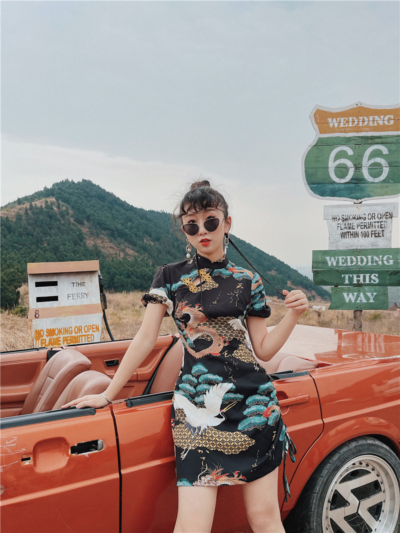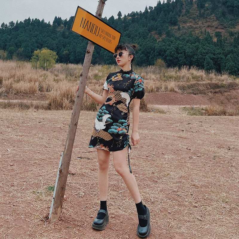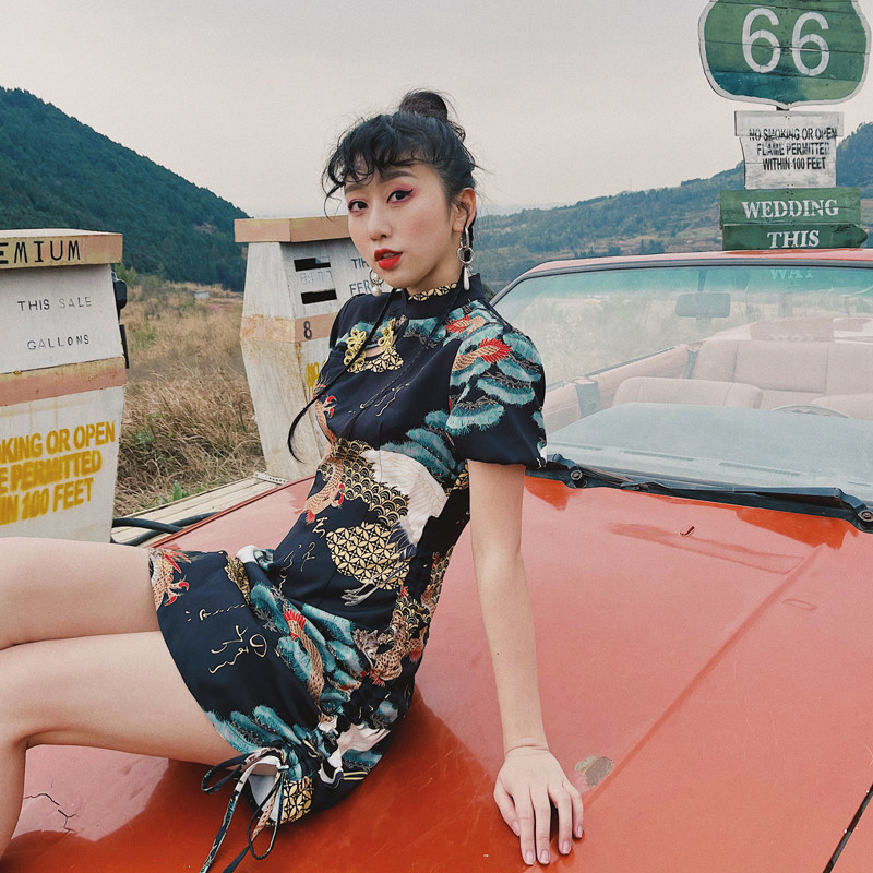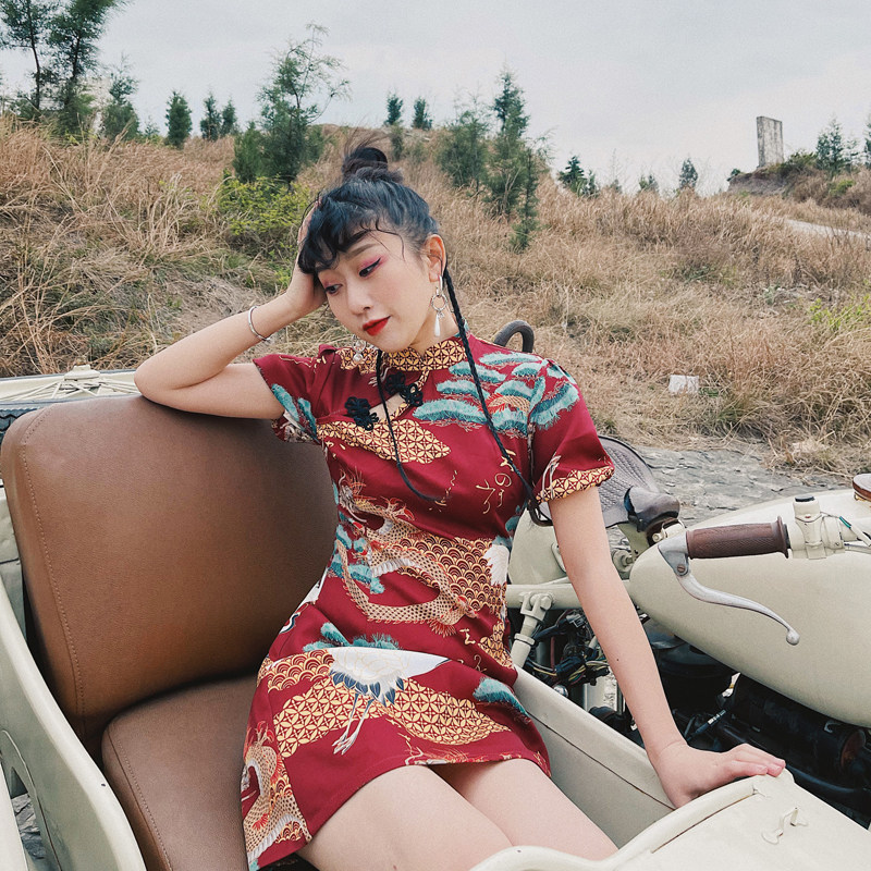 Huang Niu Niu original You Long Songhe new print Chinese style improved asymmetrical girl slim short cheongsam women