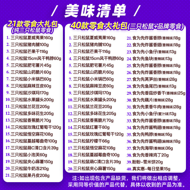 21 (pure three squirrel snacks) 40 large packages (three squirrels + brand snacks)