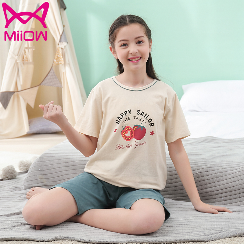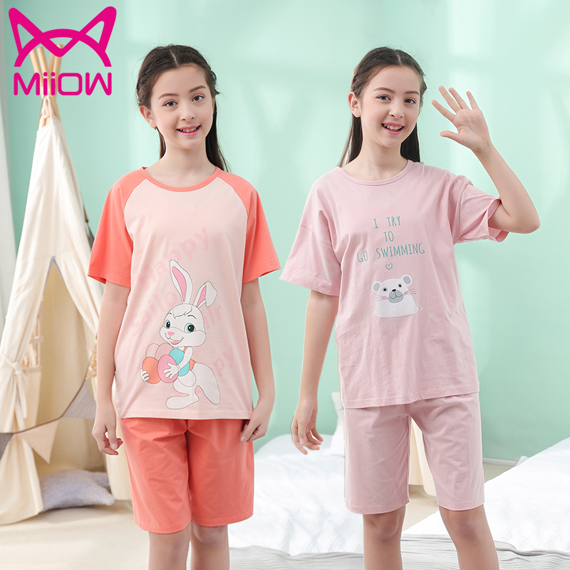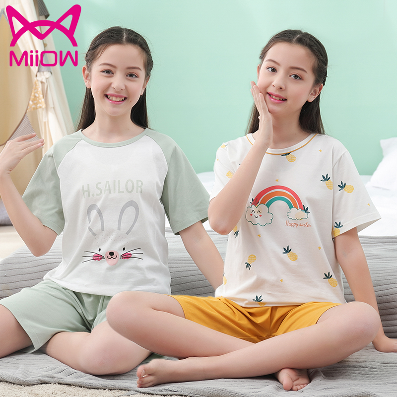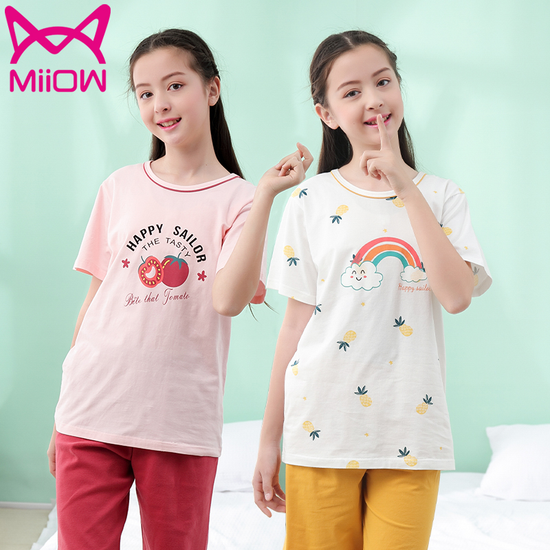 Cat people girls cotton short-sleeved home clothes children's suit middle and big children's cotton pajamas youth spring and summer thin section