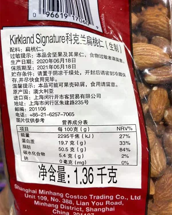 Shanghai Costco open city guest KIRKLAND Kokland Nuts Nuts Big Almond 1 36KG