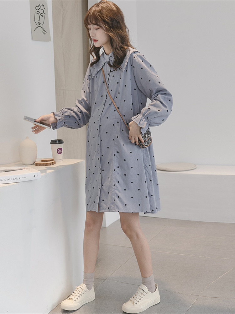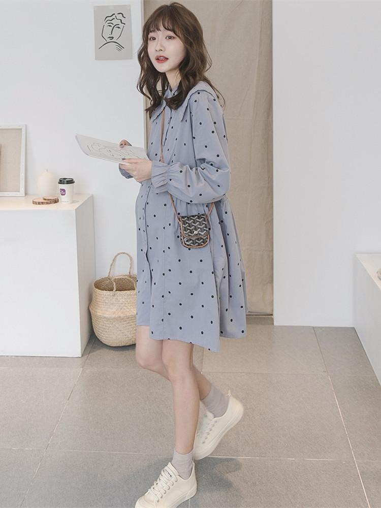 Pregnant women spring dress 2021 new Korean fashion medium and long version wave point loose cotton and linen shirt skirt tide mom