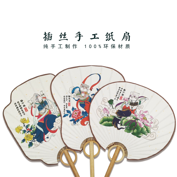 Rabbit manul Chinese style classical flying series long handle handmade rice paper fan