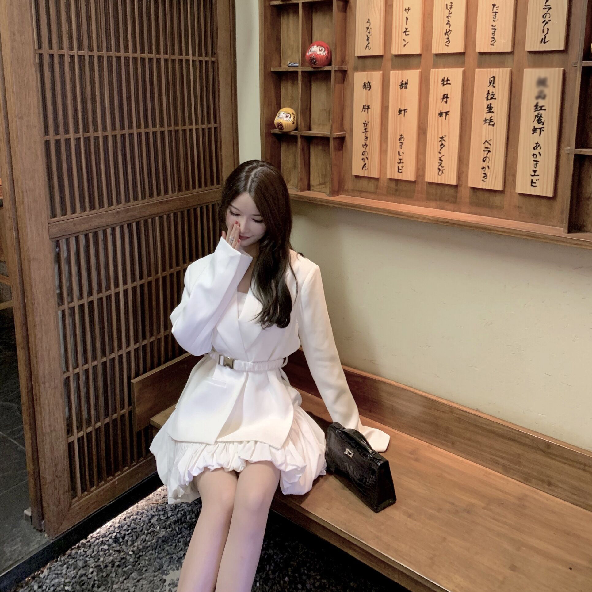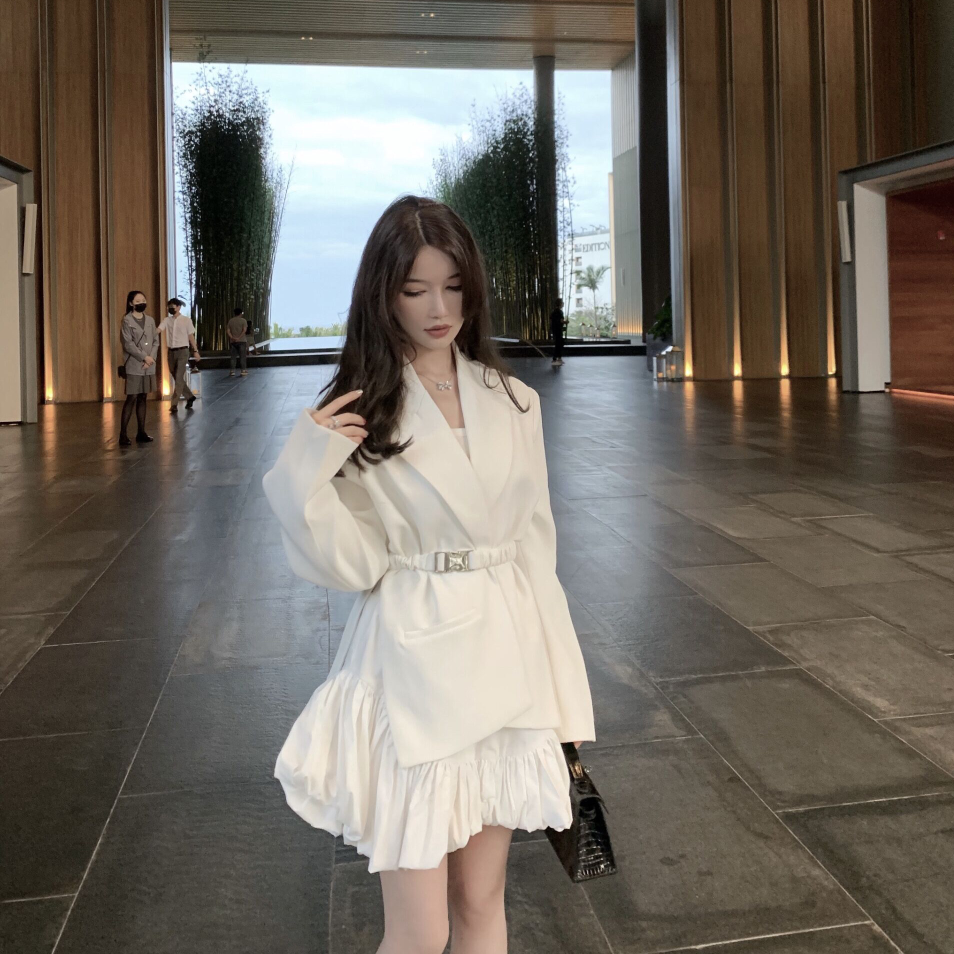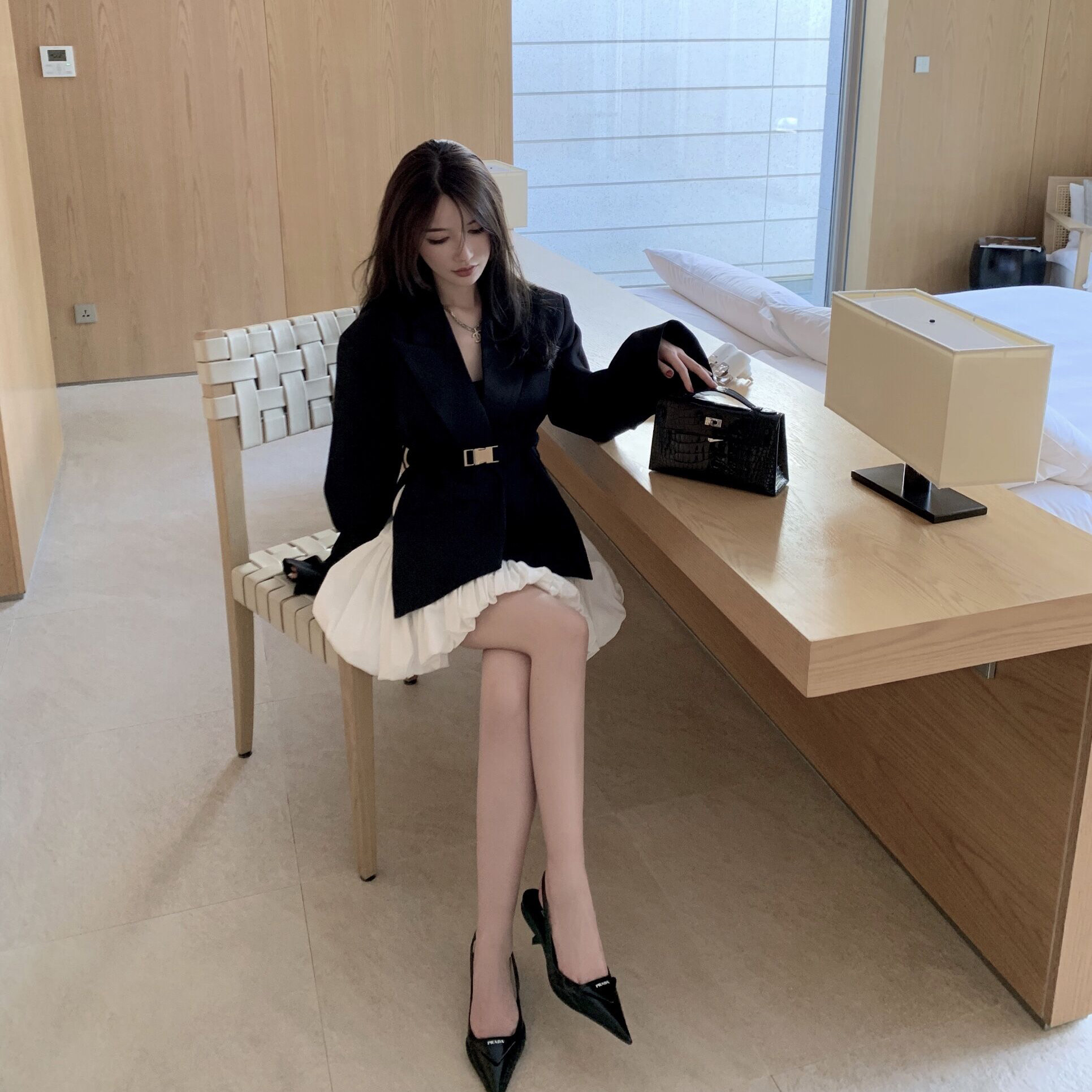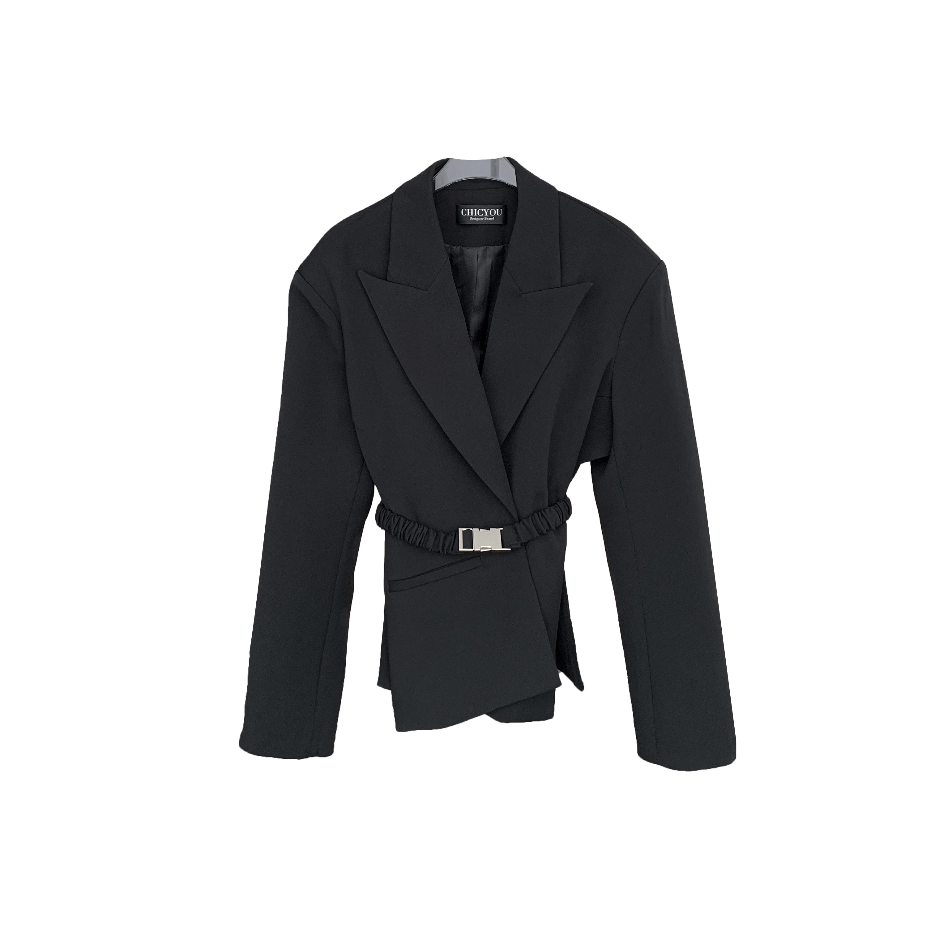 CHICYOU BLACK AND WHITE TWO-COLOR FUNCTION BUCKLE OPEN FORK WIDE SHOULDER CASHEW TRENDY INS NET RED STARS SAME SUIT