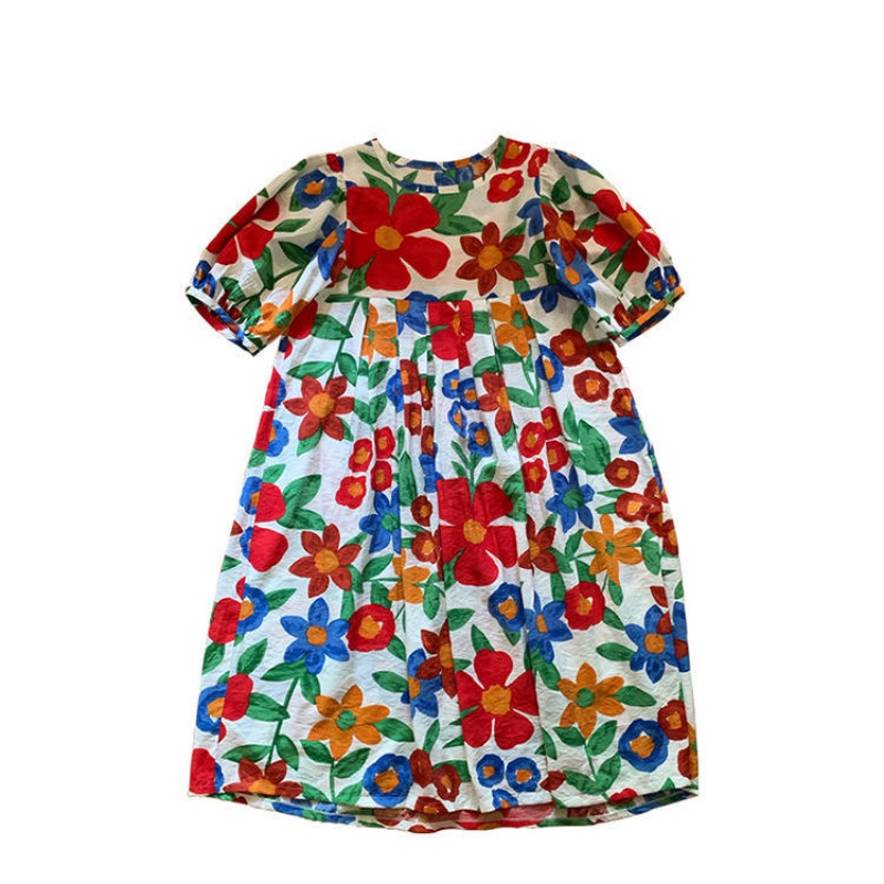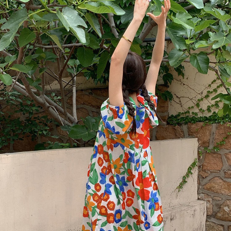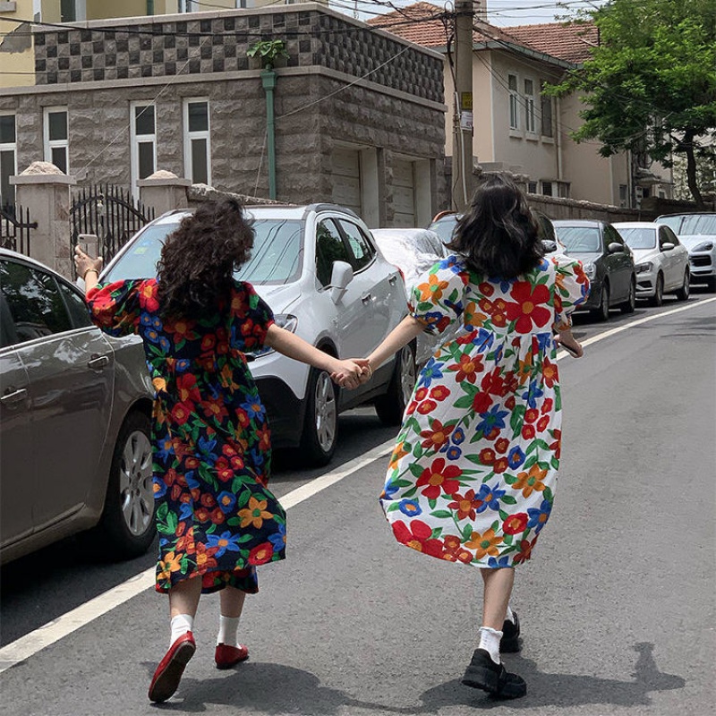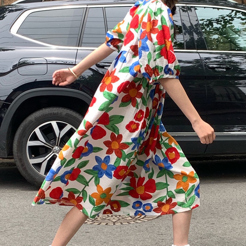 2021 spring temperament bubble sleeve dress female French retro printed long dress loose thin medium-long version of the skirt female