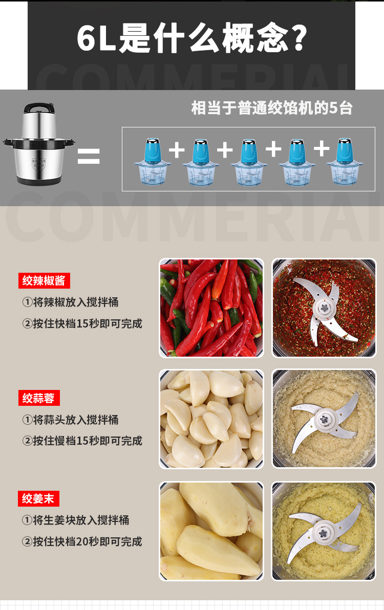 5 liters can hit 3-4 kilos 6 liters once you can beat 5-6 kilos 5 litres of steel large capacity 1 set knife (no preparation with knife) 5 liters steel large capacity 2 sets of knives (with 1 spare knife) 5 litres of steel large capacity 3