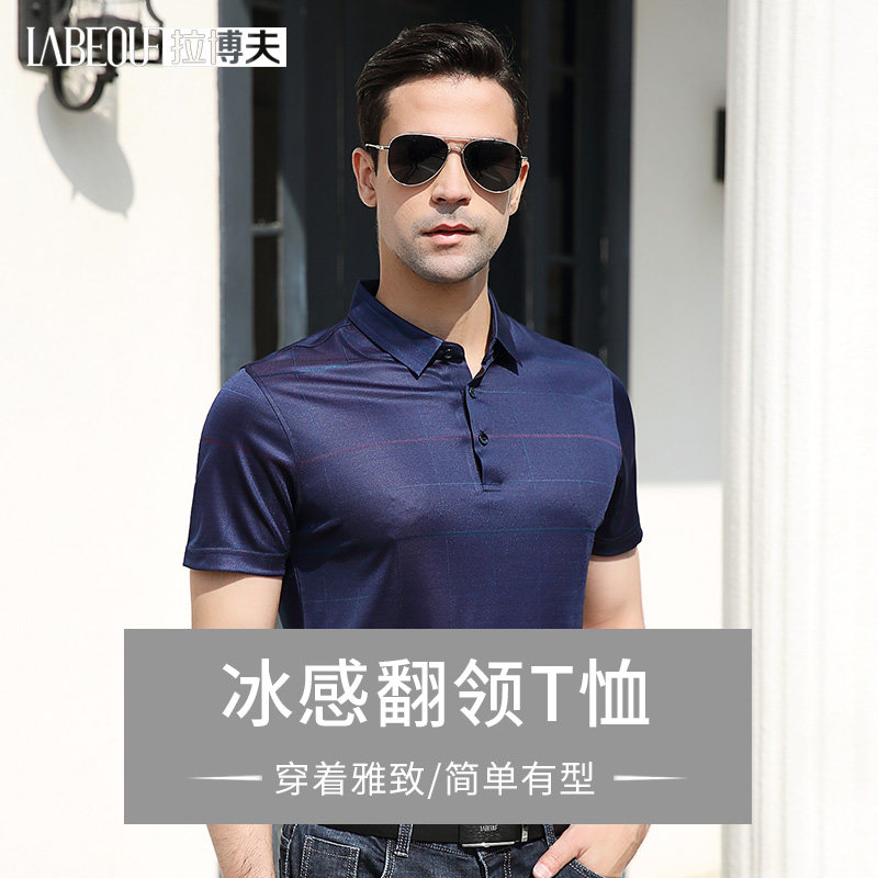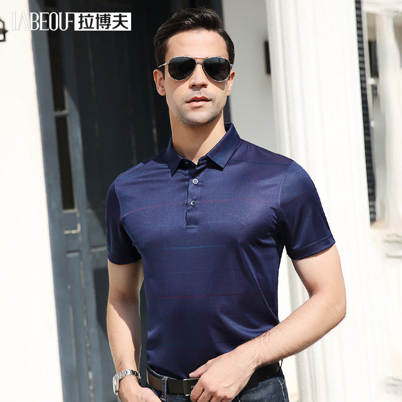 LaBeouf plaid silk T-shirt men's business casual middle-aged father's summer breathable cool feeling mulberry silk short sleeves