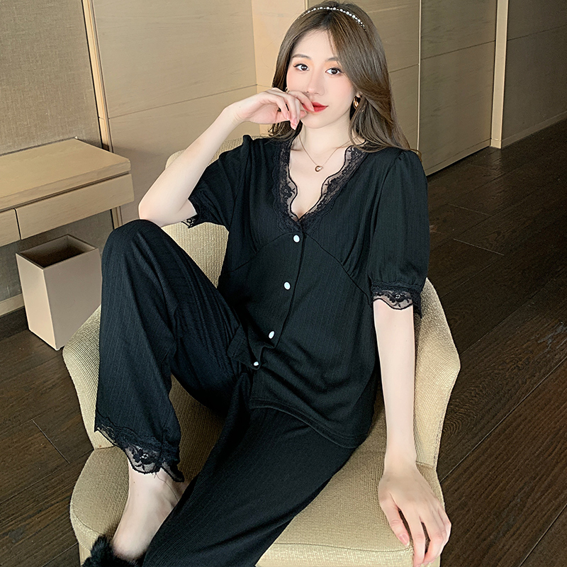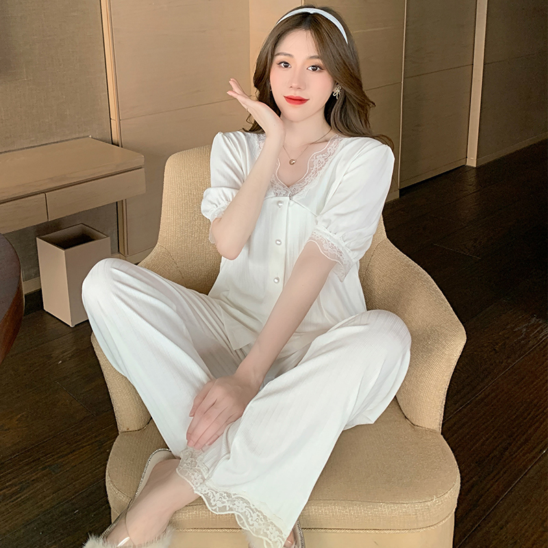 Sexy lace pajamas women's summer pure cotton thin V-neck scheming fairy palace style white home service net red autumn