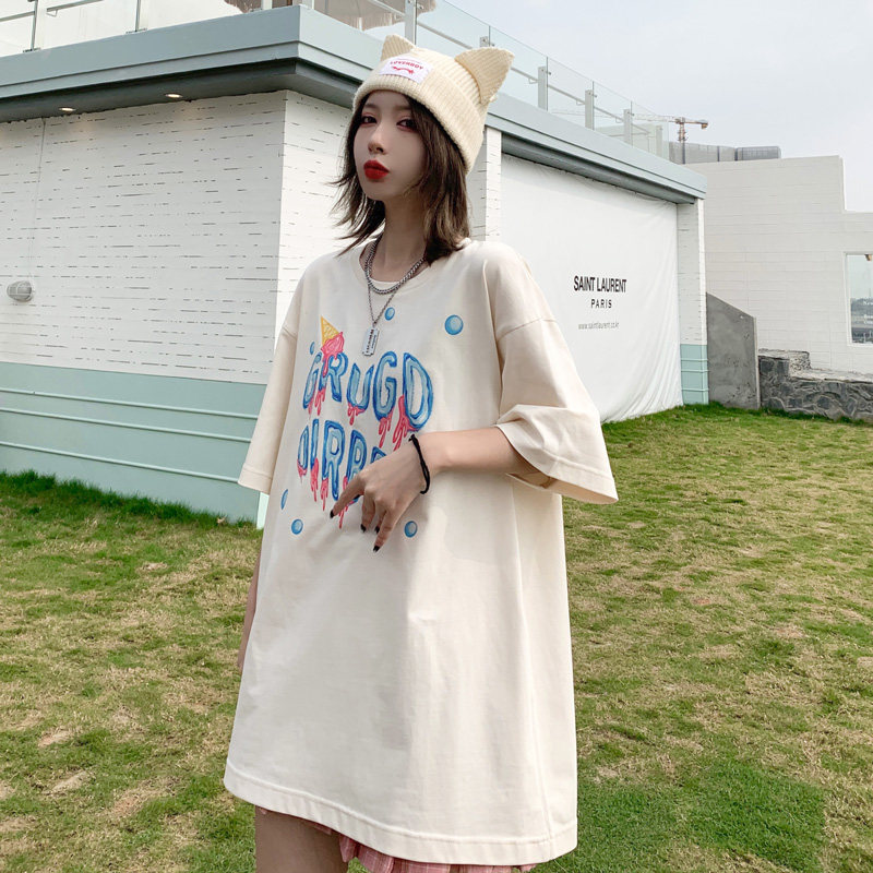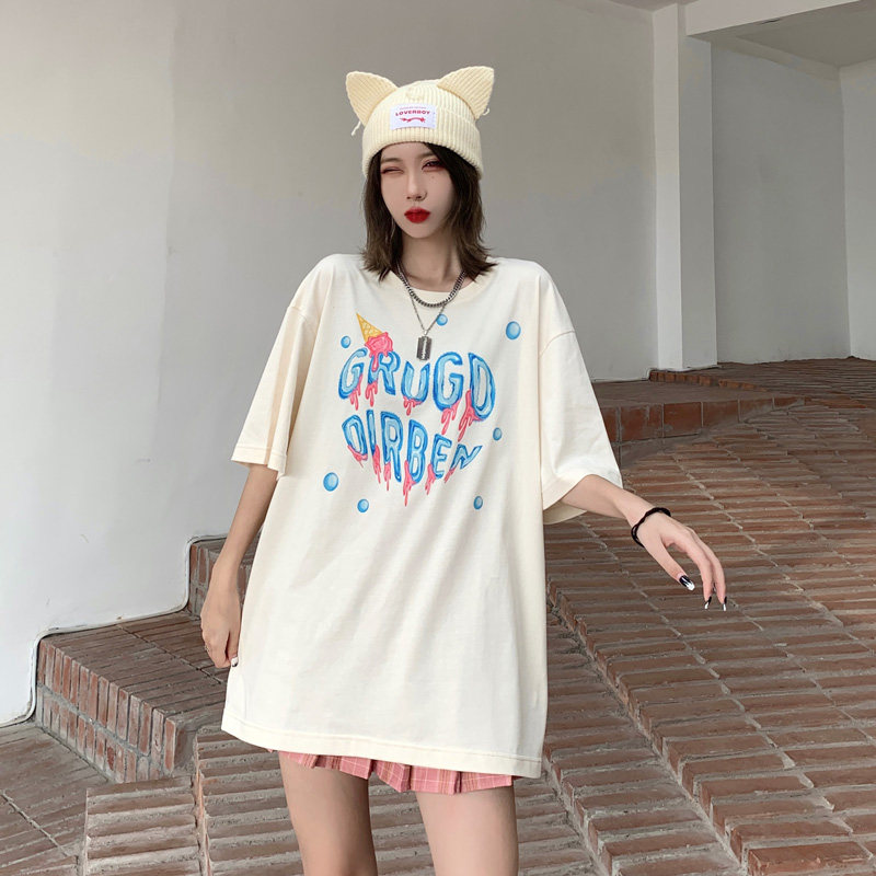 GRUGD DIRBEN ice cream love short-sleeved white T-shirt women's round neck printed cotton all-match loose top