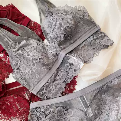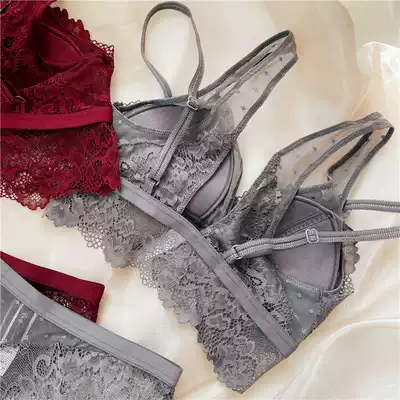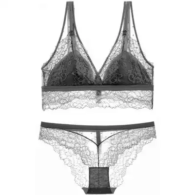 Bra sexy lace mesh thin cotton without steel ring gathered deep V closed pair of breasts underwear set girl transparent and comfortable
