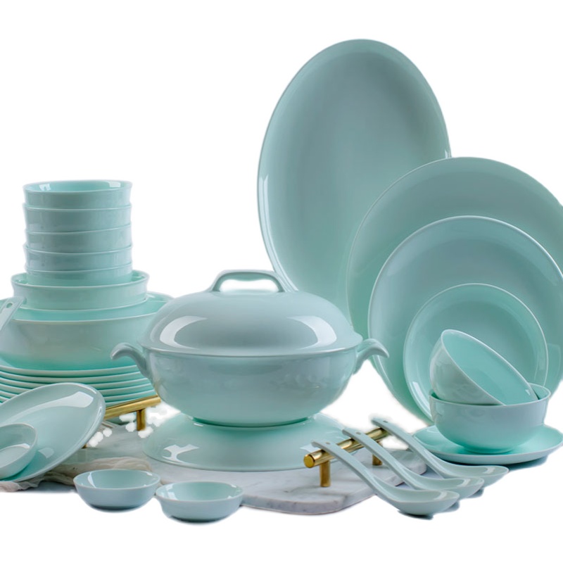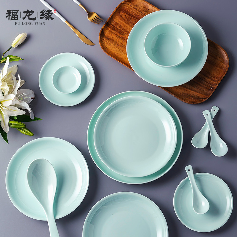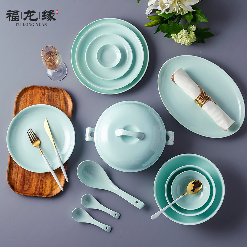 Fulongyuan celadon tableware set Jingdezhen bone china Chinese style simple dish set household bowls and chopsticks combination