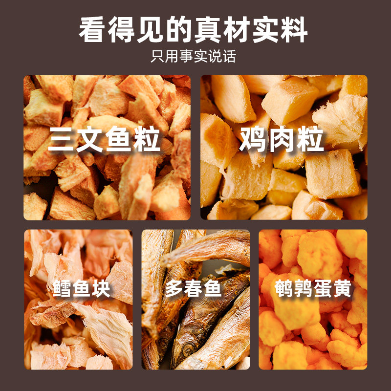 Mixed meat freeze-dried 1 can diced chicken 120g cod fillet 80g salmon diced 90g quail egg yolk 190g dried spring fish 80g large package of dried shrimp 1 can large can of dried shrimp and chicken 235g