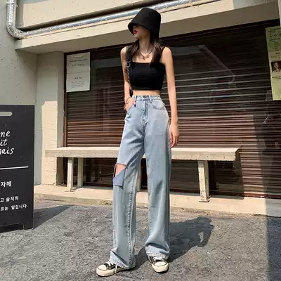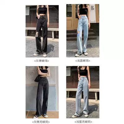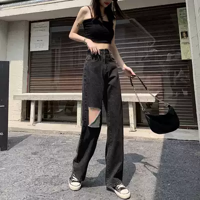 Summer new black straight high-waisted jeans women's summer thin perforated wide-leg mopping pants hot girls hanging trend