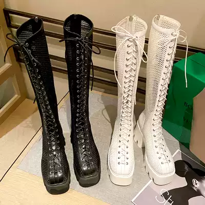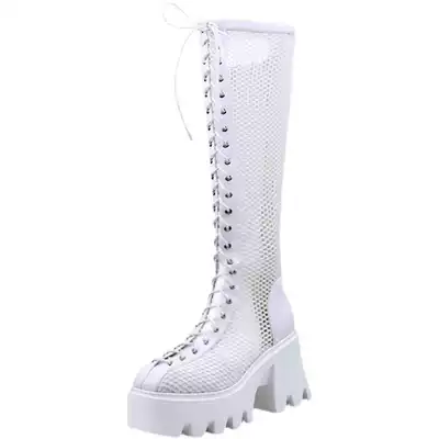 Leather thick-heeled white mesh boots female Xia Chao high-heeled lace-up high-end long cold boots