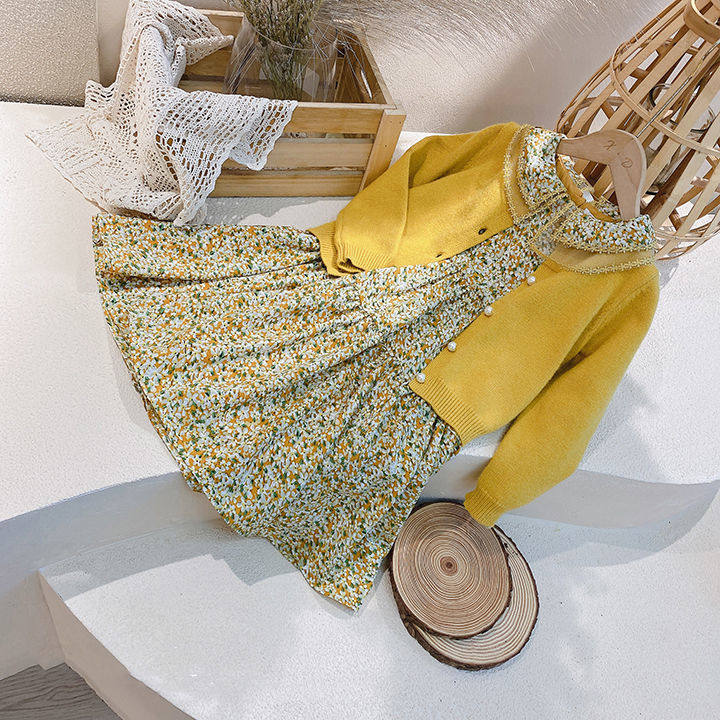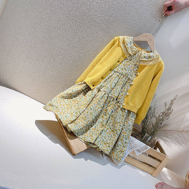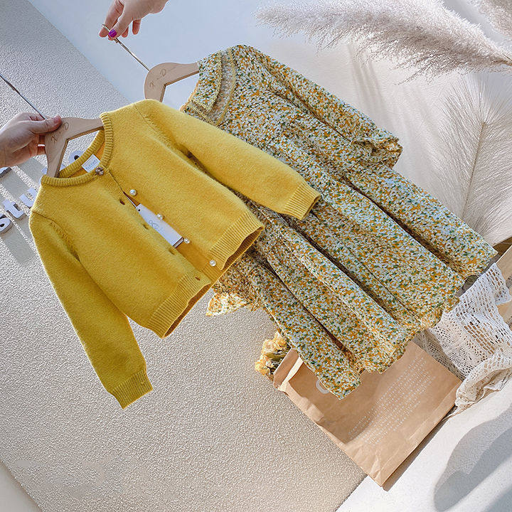 Single children's clothing 2021 spring and autumn new products girls Korean knitted cardigan retro chiffon dress two-piece suit