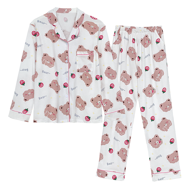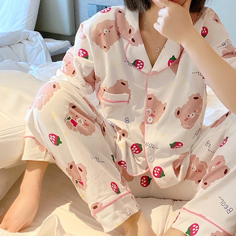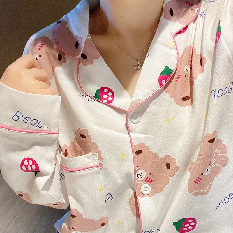 Strawberry Cubs pyjamas women's spring and autumn cardiovert sweatshirt pure cotton long sleeve long pants cute cartoon cardiovert suit Home Suits New