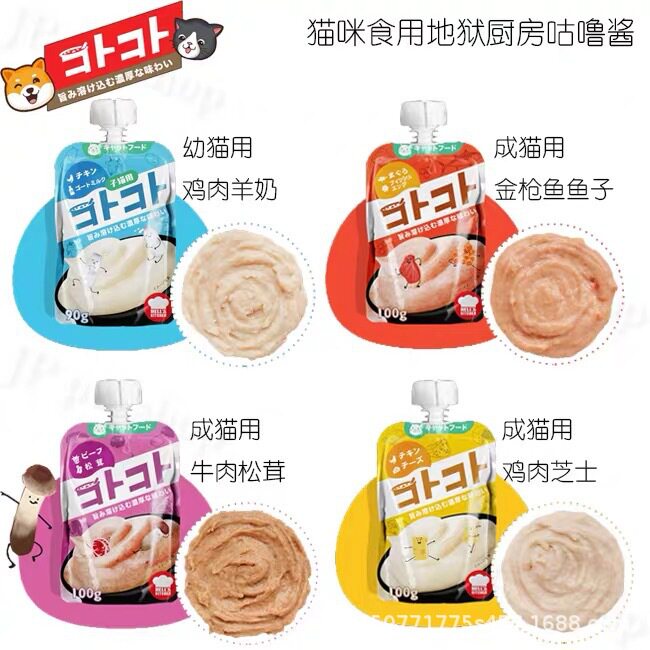 Chicken Broth Cream Thick Soup 80g Tuna Fish Cream Thick Soup 80g Chicken Goat Milk 90g (young cat) Turkey Pumpkin 100g Chicken Cheese 100g Tuna Fish 100g Chicken Cranberry 10