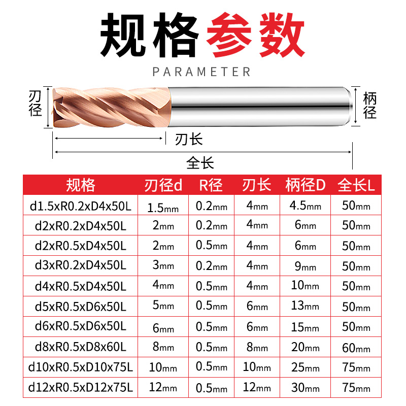 55 Degrees Tungsten Steel Bull Nose Milling Cutter 4 Blades Hard Alloy Round Nose Milling Cutter Numerical Control Flat Bottom R Corner Knife Bull Nose Knife Round Nose Knife