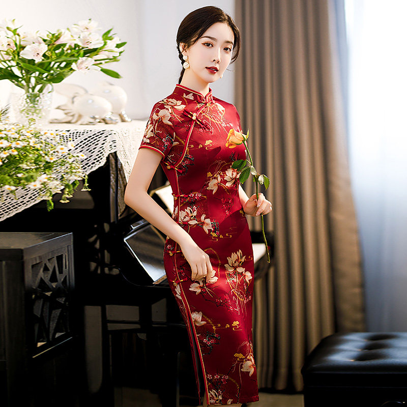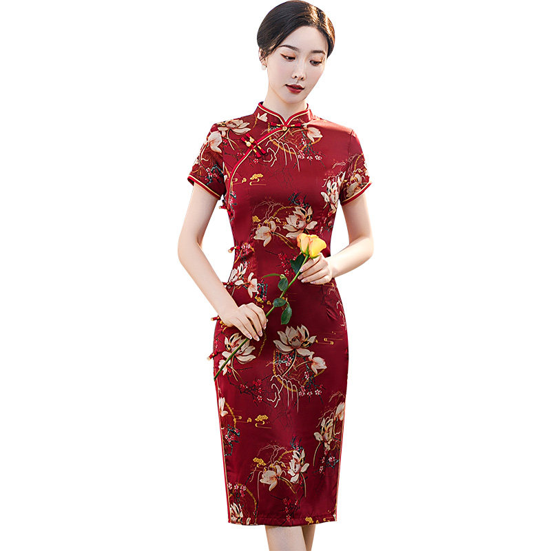 Red qipao 2022 new female retro short sleeve Daily Mama Costume Improved version of the summer medium long version