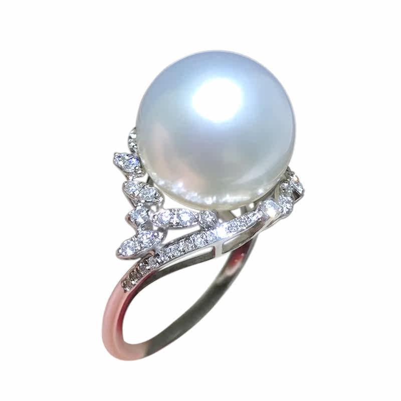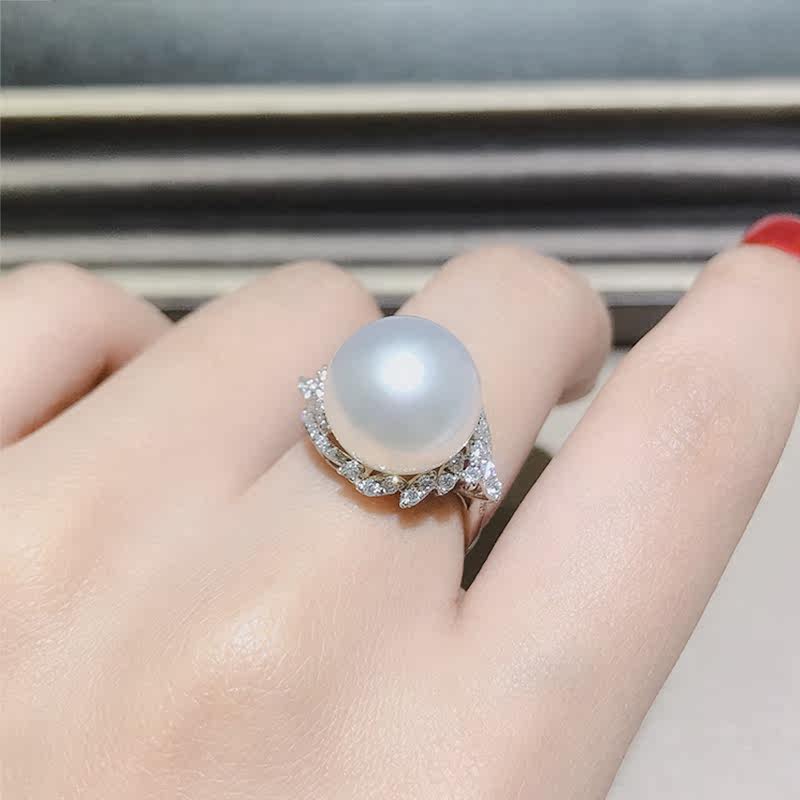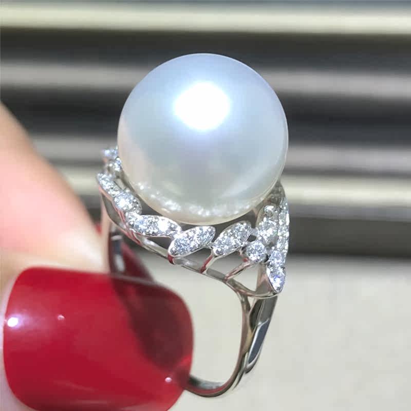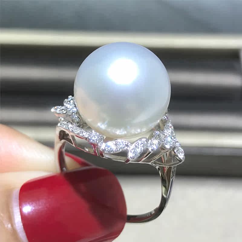 13mm Cold Light Australia White Pearl Ring Nanyang White Pearl Ring Half Carat Diamond Heavy Gold King Set Luxury and Noble