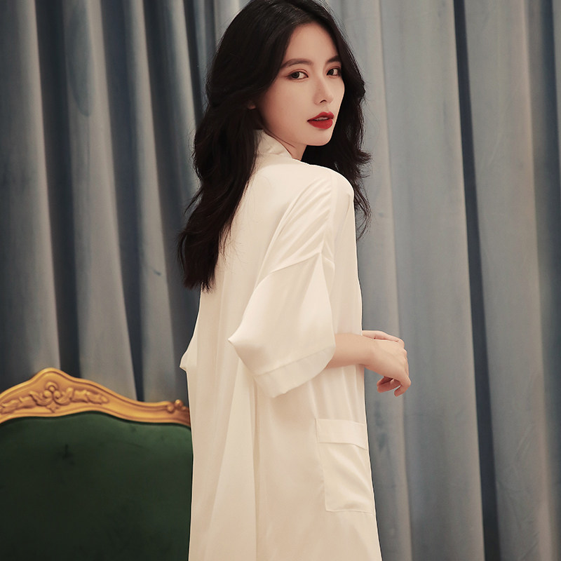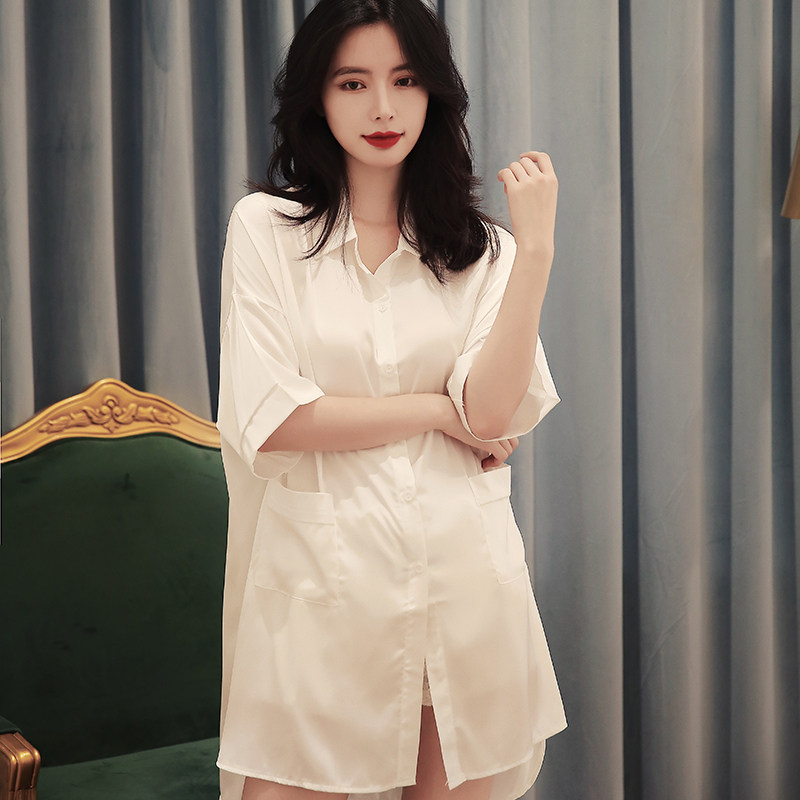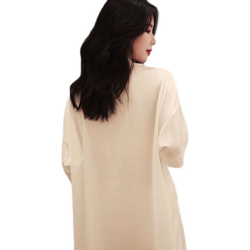 White nightdress women's 2022 new spring and autumn thin ice silk shirts home service women's sexy boyfriend style pajamas
