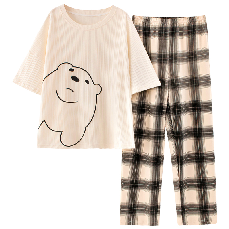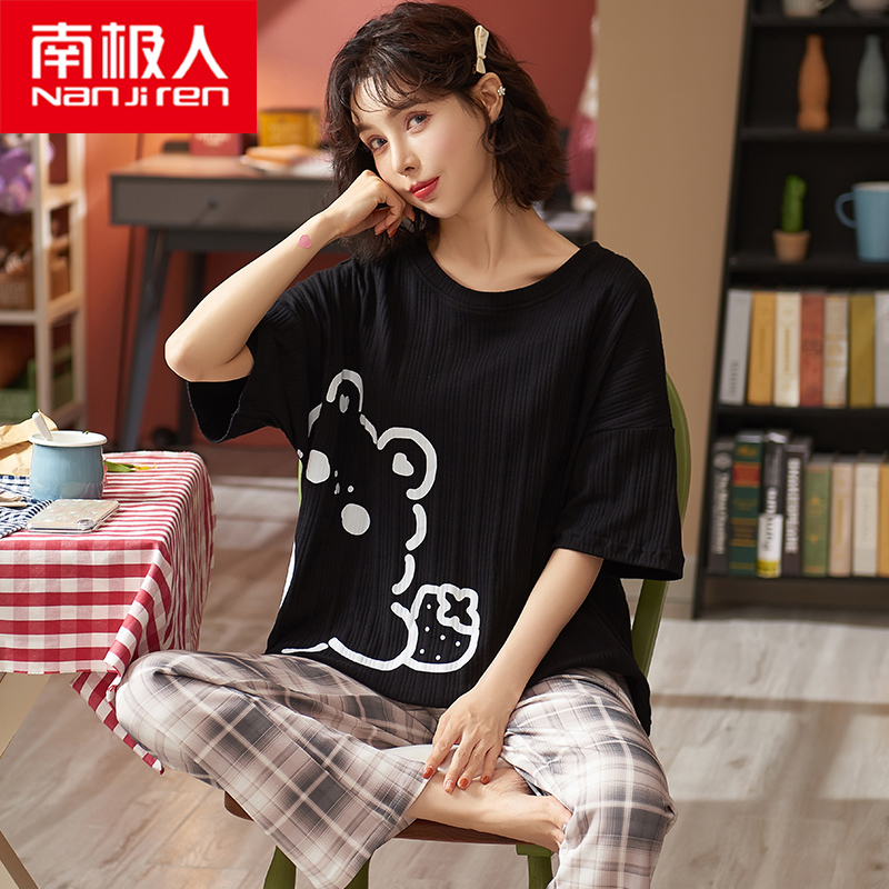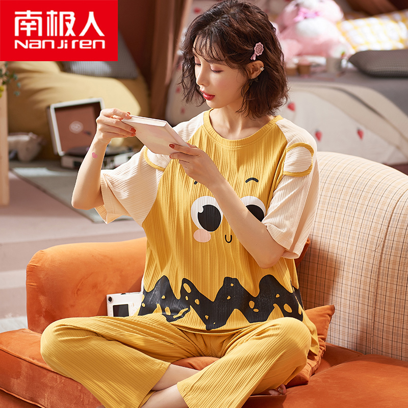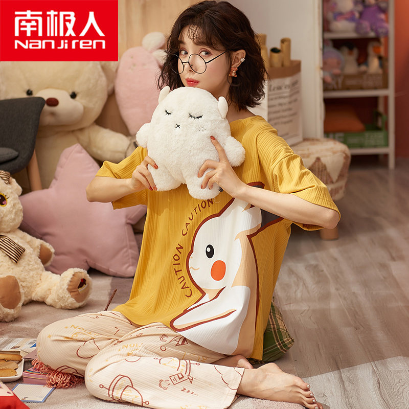 South Pole 2022 New sleepwear female summer pure cotton short sleeve long pants Korean version cute cartoon exterior wearing home clothes