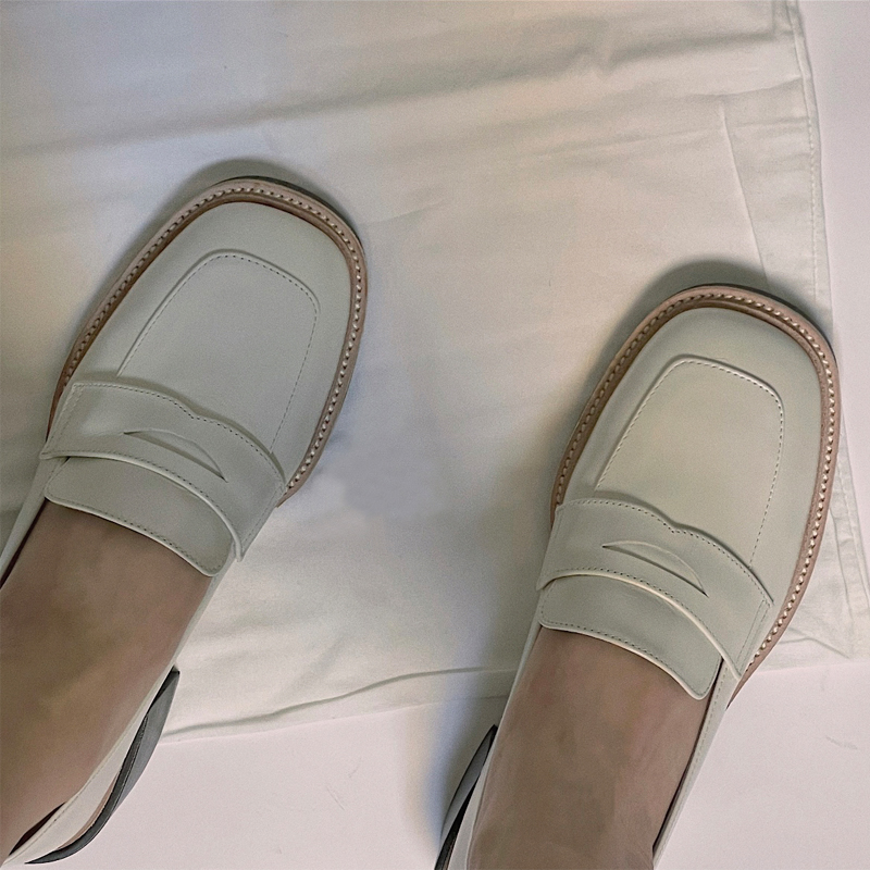 2022 Spring and Autumn College Style Thick-soled Loafers Square Toe Thick Heel Slip-On Leather White British Small Leather Shoes