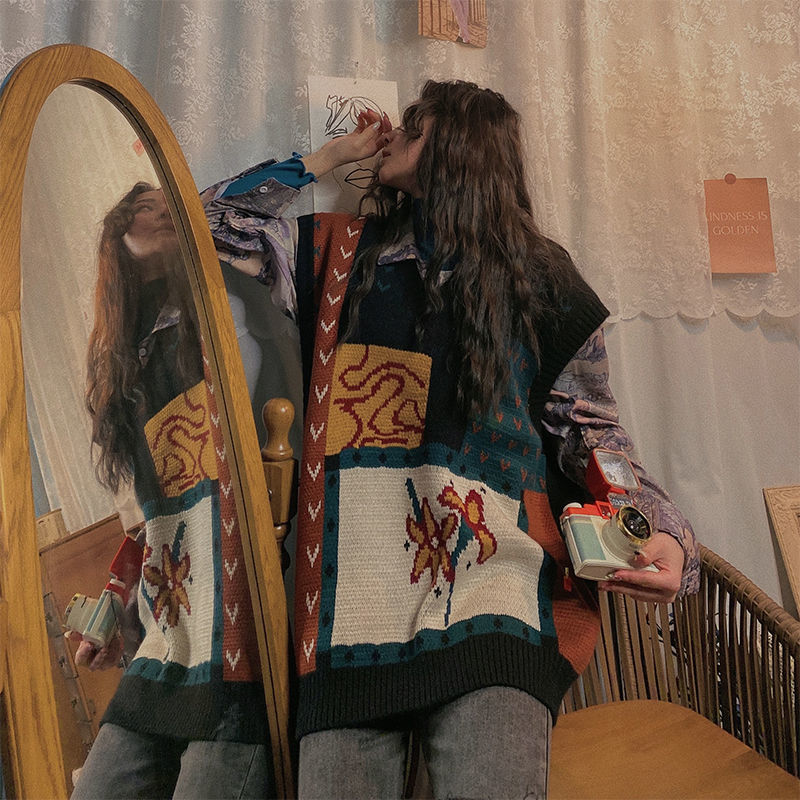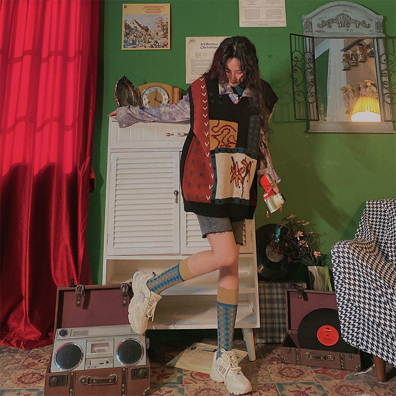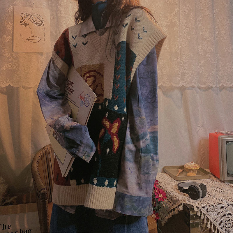 2021 spring retro vintage V collar patterned sweatshirt with long sleeves dactured shirt suit women loose horse chia and two sets of women