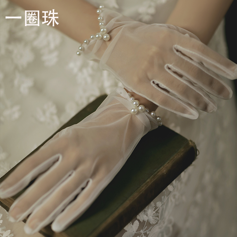Retro white wedding gloves bride short champagne color mesh super fairy pearl photo photo accessories photo studio