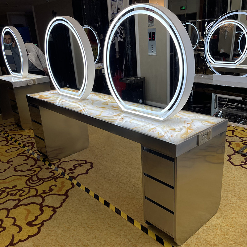 High-end hairdresse shop with lamp hair salon special marble countertop mirror table minimalist haircut and dyed single double-sided sheared mirror
