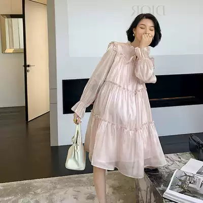 Touch Miss Pregnant Women autumn dress light luxury elegant wooden ear loose big size Belly Belly long sleeve organza dress