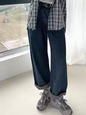 Fine points tear up the falsehood to break free from the shackles hems folding horizontal craft retro dark blue loose wide-legged jeans women