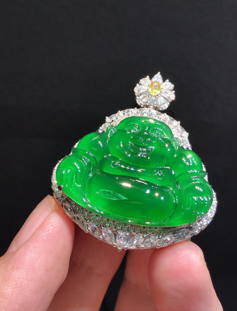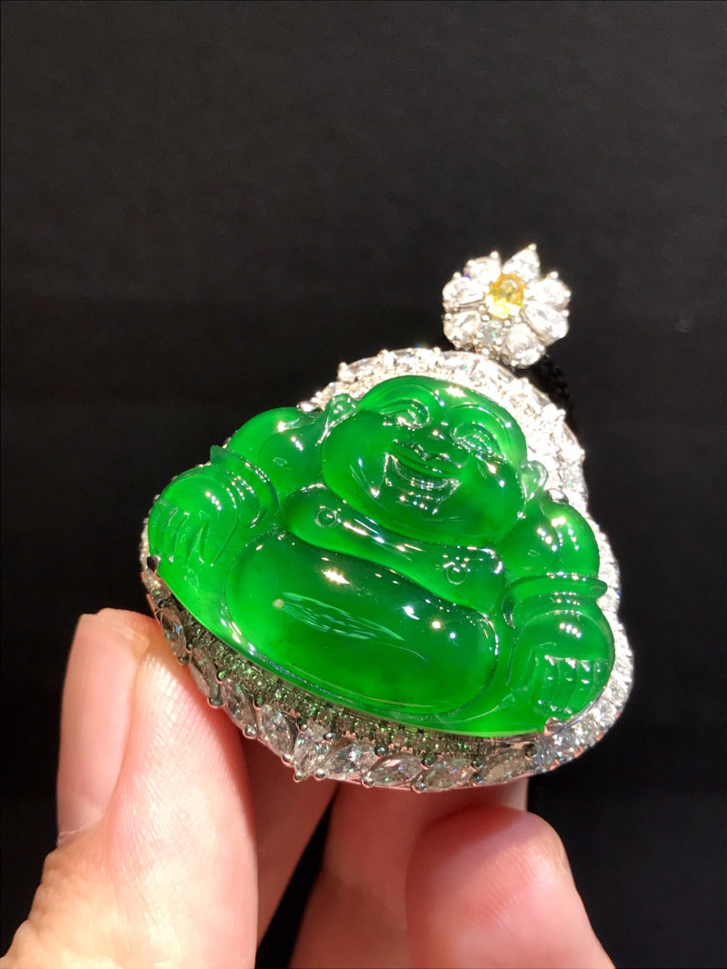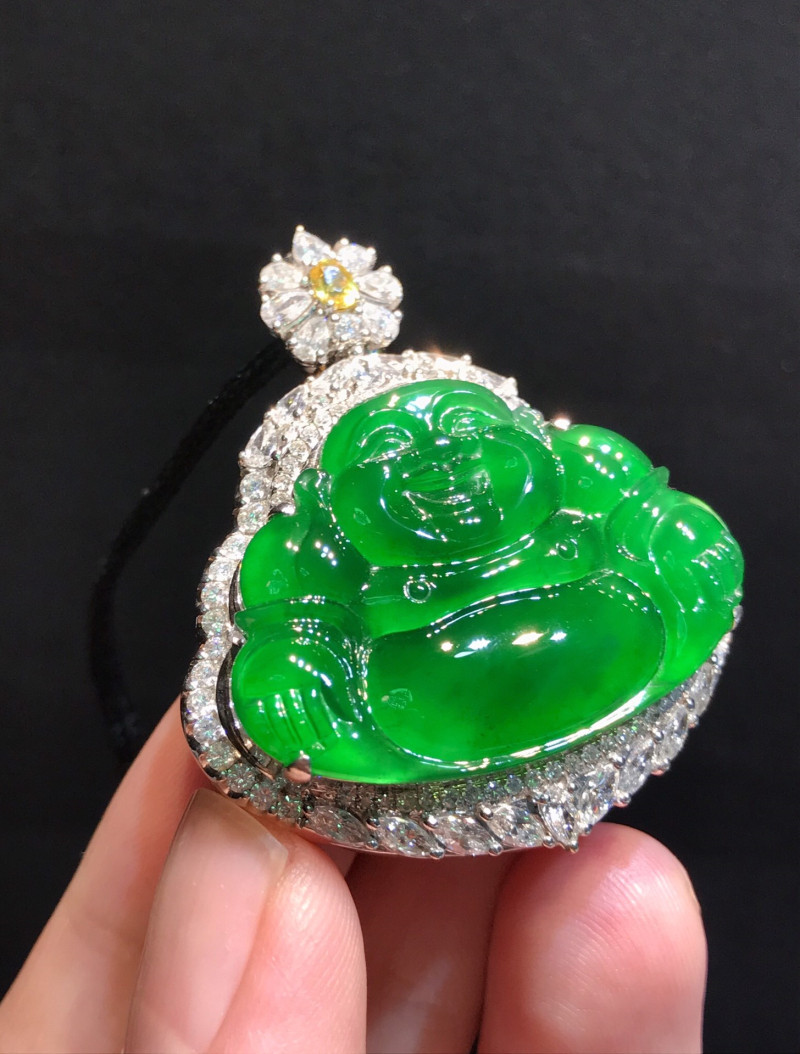 Emerald Buddha Ruyi leaf pendant ice seed Yang green jade Buddha standing Buddha bare stone 18k inlaid Maitreya Buddha jade pendant female