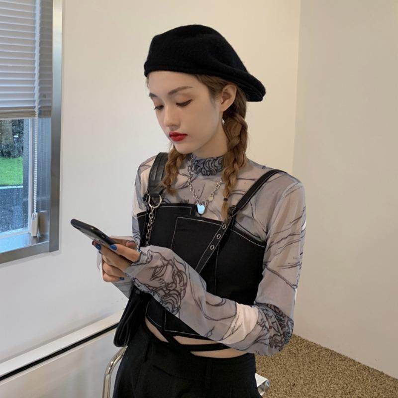 Fashion Suit Woman Spring Autumn Printed High Neckline Gauze Undershirt Stack Wearing Jacket Design Sensation Vest Waistcoat waistcoat Two sets