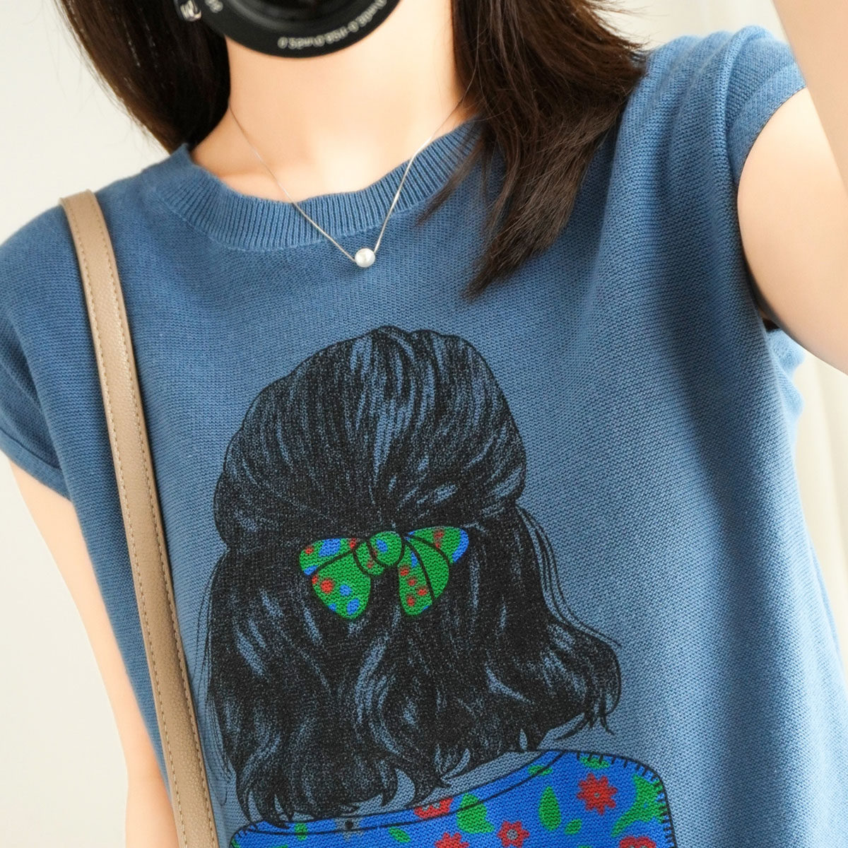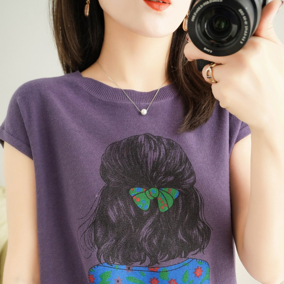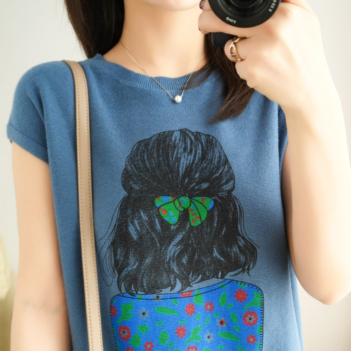 21 new cotton linen knit thin short sleeve t-shirt woman round collar printed loose minimalist pure cotton cover head slapped bottom shirt